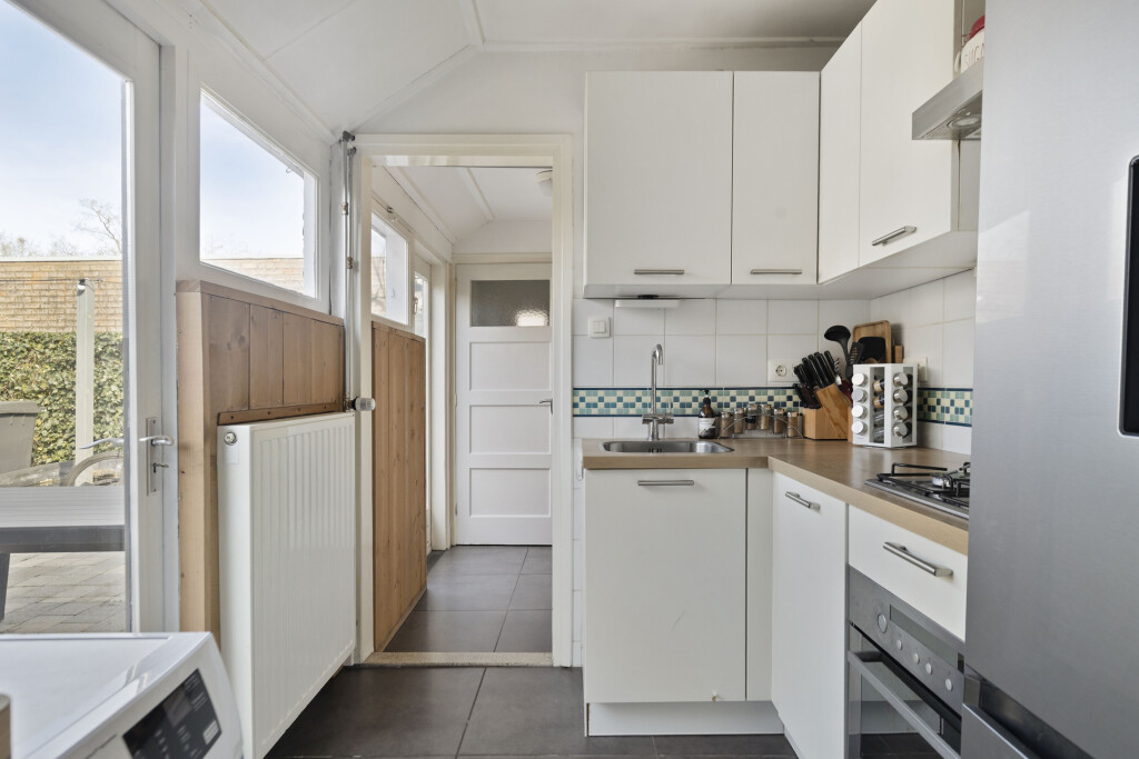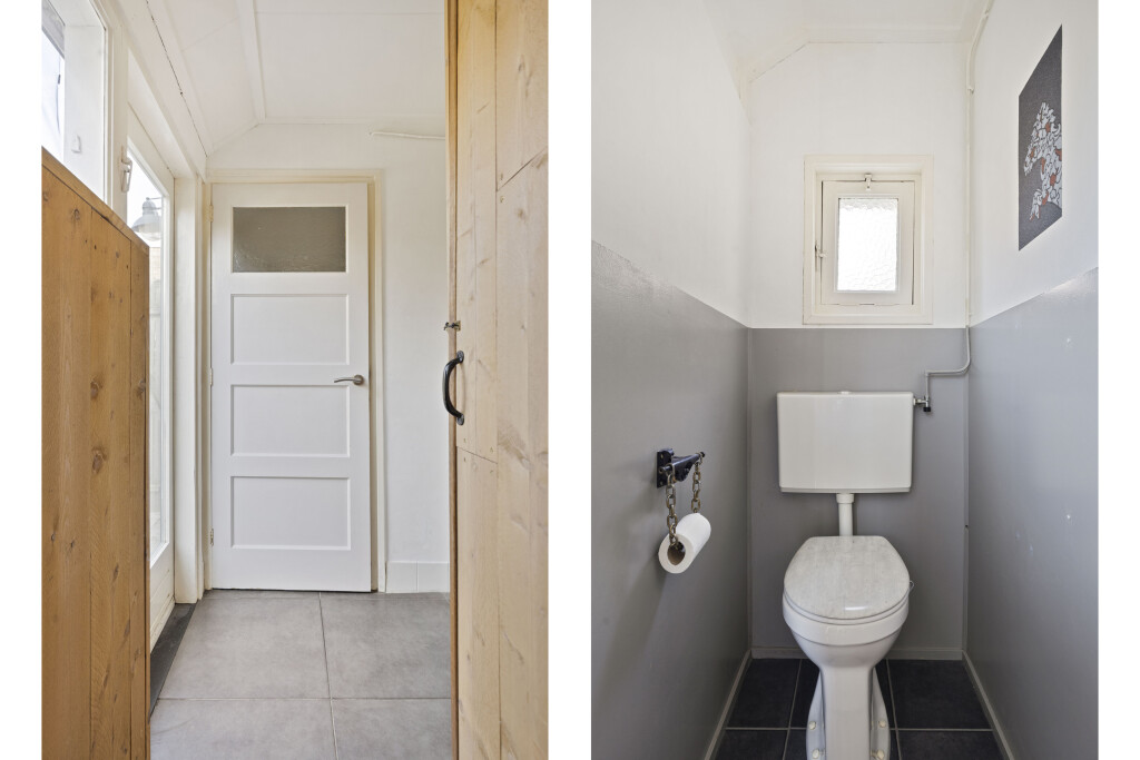 Ook de eetkamer is voorzien van originele sierschouw, ingebouwde kast en heeft een gezellige eetbar. Vervolgens kom je aan de achterzijde van de woning. Hier zijn het toilet, keuken en de badkamer gesitueerd.