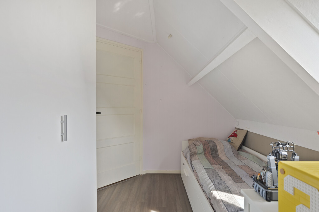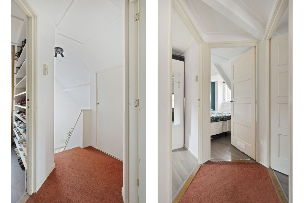 Via de fraaie bordestrap kom je op de eerste verdieping. Hier bevinden zich de overloop en drie slaapkamers. Alle slaapkamers zijn voorzien van een laminaat vloer. Vanuit één slaapkamer is de bergvliering te bereiken. Ook op de overloop is bevindt zich nog een ingebouwde bergkast.