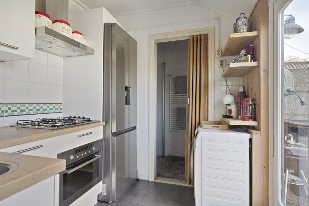 Tevens is in de keuken de aansluiting voor de wasmachine. Aansluitend aan de keuken is de badkamer die uitgerust is met een wastafel en een douche.