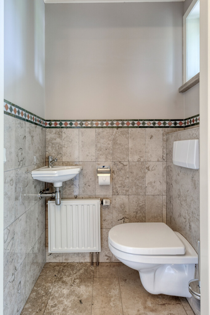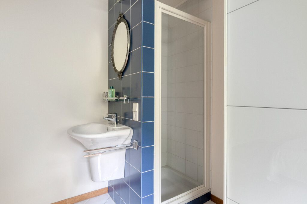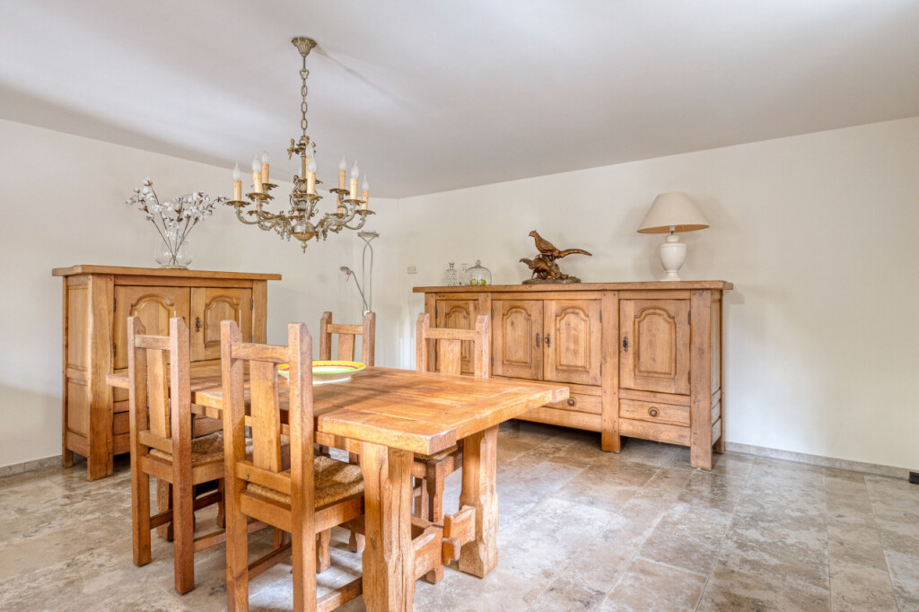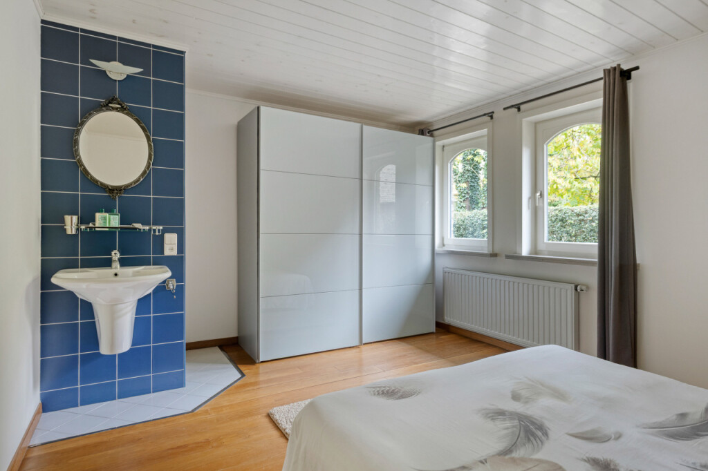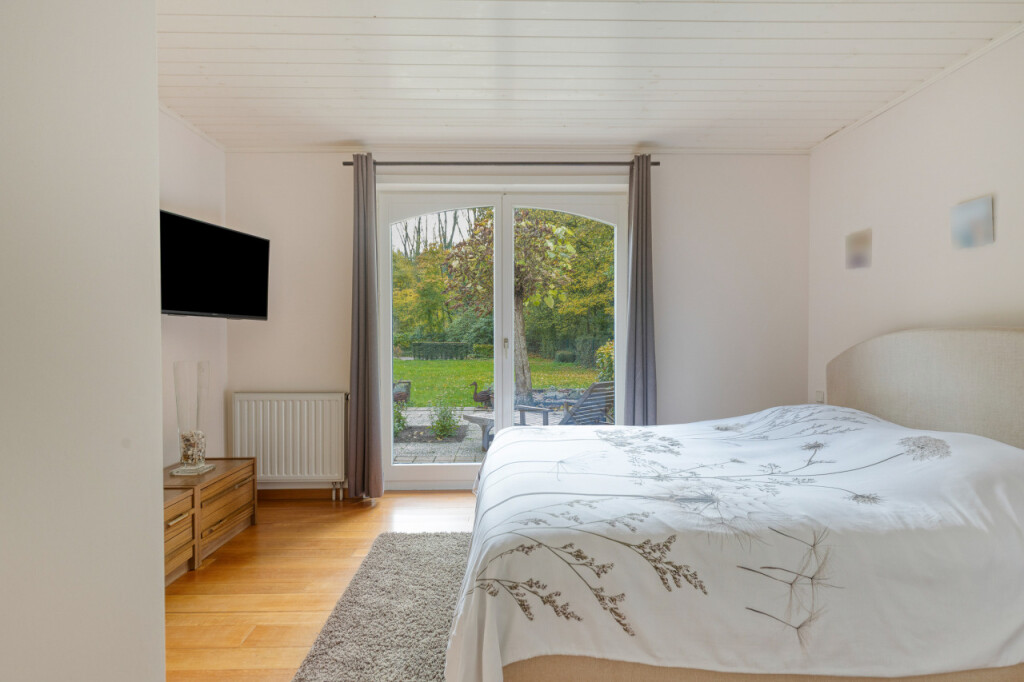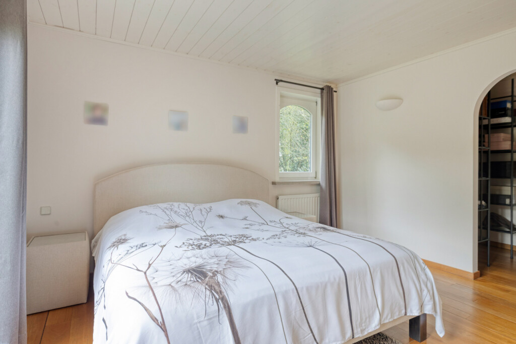 De woning beschikt over drie comfortabele slaapkamers, elk met hun eigen sfeer. De master bedroom is een oase van rust, met openslaande deuren naar de tuin en een elegante dressing vanwaar er directe toegang is tot de badkamer. De grootste logeerkamer biedt gasten een eigen douche en wastafel; een luxe en praktische toevoeging.