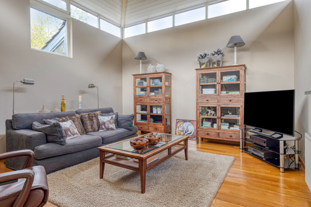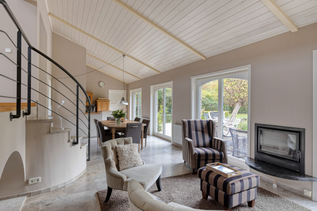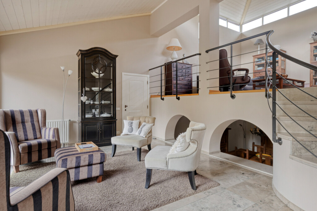 Via een evenzo mooie trap naar boven; bereikt u een sfeervolle kamer welke momenteel is ingericht als TV-kamer. Deze kamer is dusdanig ontworpen dat er in deze ruimte altijd een mooie lichtinval is. Hier kunt u optimaal genieten van de avondzon en is het heerlijk ontspannen.