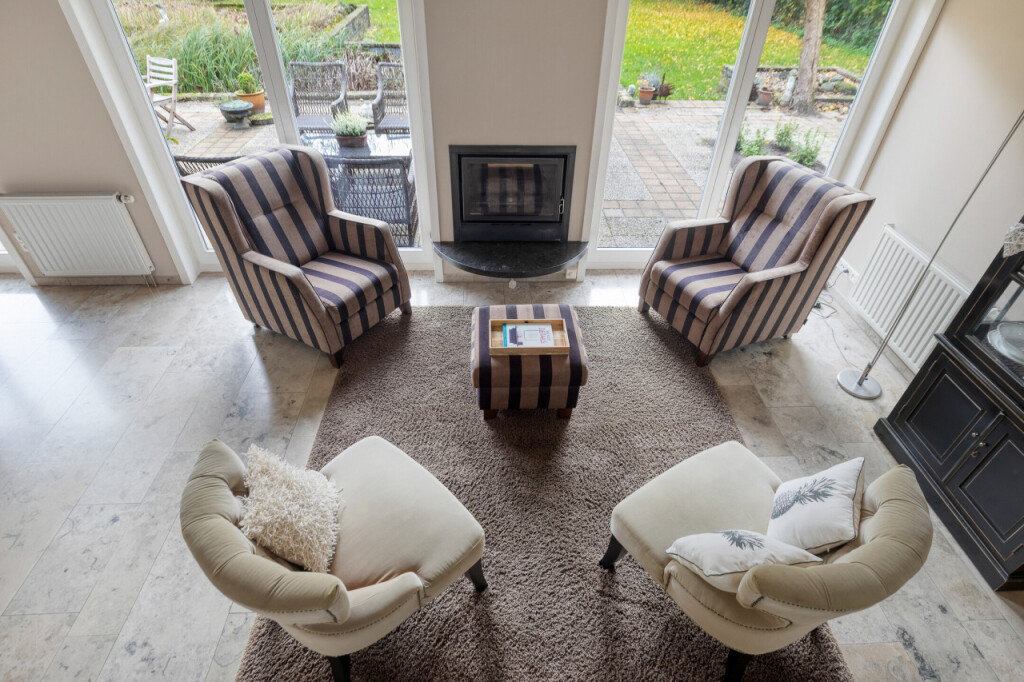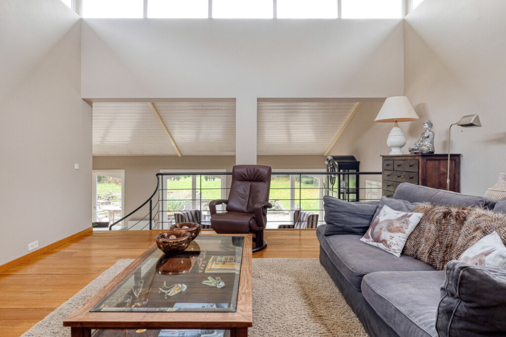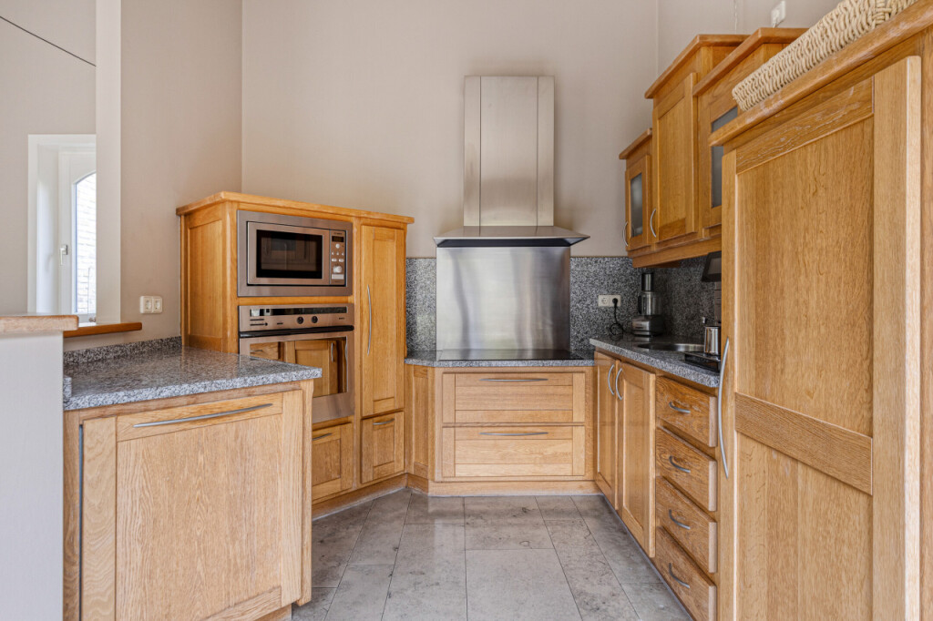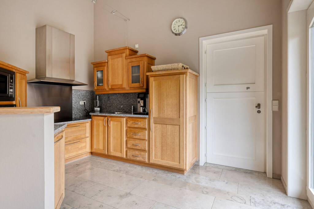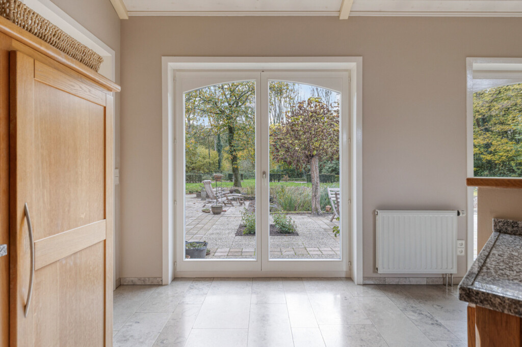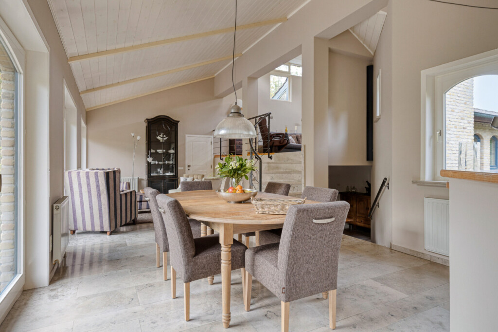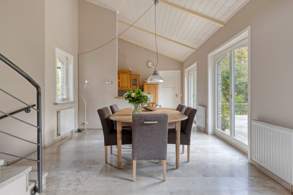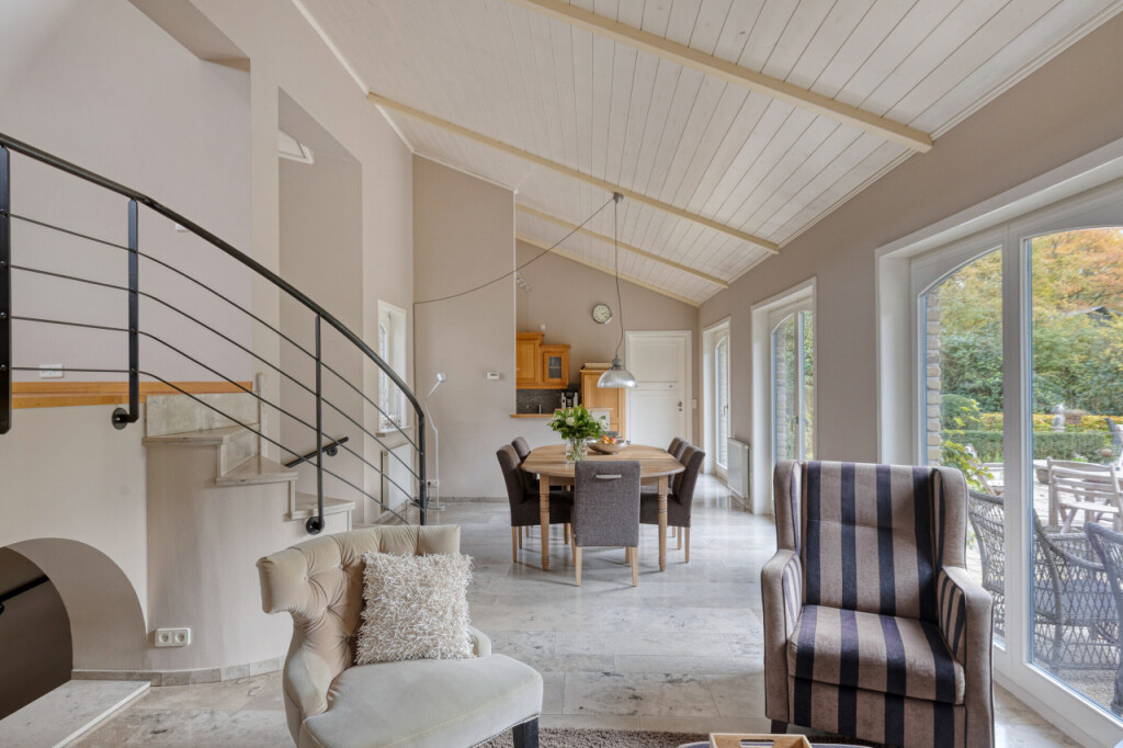De ruime leefruimte met eethoek en zithoek vormt het hart van het huis; een plek waar binnen en buiten naadloos in elkaar overgaan. Vanuit elke hoek geniet u van het uitzicht op de groene tuin. De nette keuken is sfeervol geïntegreerd in de leefruimte en nodigt uit tot lange avonden tafelen met uitzicht op het terras en het achterliggende bos.