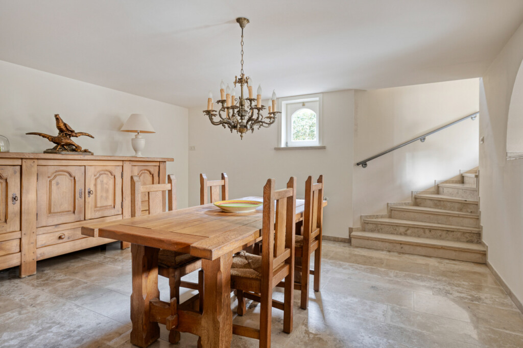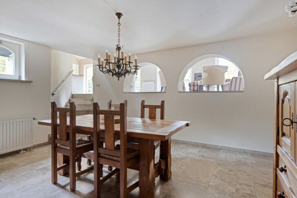 Via de stijlvolle trap naar beneden; bereikt u een eetkamer die ook ideaal als werkkamer dienst kan doen.