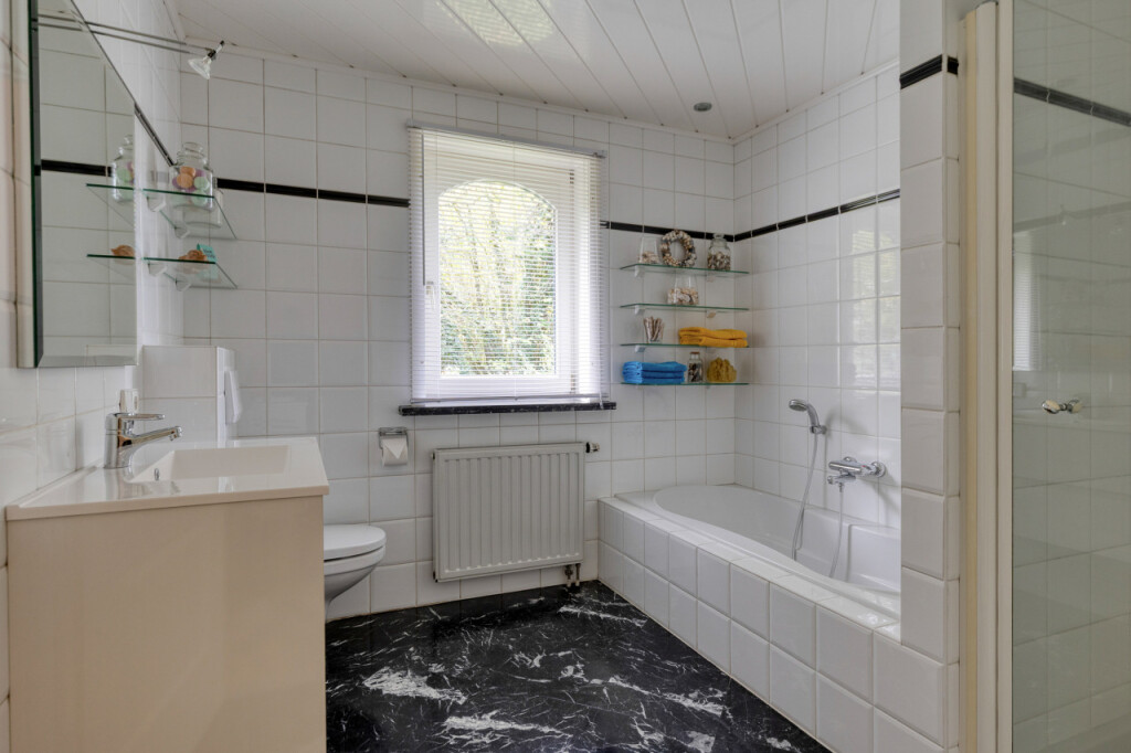 Entree in de fraaie hal met smaakvolle marmeren vloer en 2 lichtkoepels voor extra lichtinval. Hier treft u een toilet en meterkast en de inpandig bereikbare dubbele garage aan de voorzijde van de woning. In de garage is tevens de aansluiting voor de wasapparatuur, de c.v-installatie (Nefit). Middels een vlizotrap is hier een grote bergzolder bereikbaar. Vervolgens is er toegang tot een ruime slaapkamer met eigen douche en wastafel en een 2e middelgrote tot ruime slaapkamer. De master bedroom heeft heerlijke openslaande tuindeuren naar het terras en heeft een eigen dressing. Vanuit de dressing is er een deur naar de nette badkamer met marmeren vloer. Deze is voorzien van een douche, ligbad, wasmeubel en toilet.