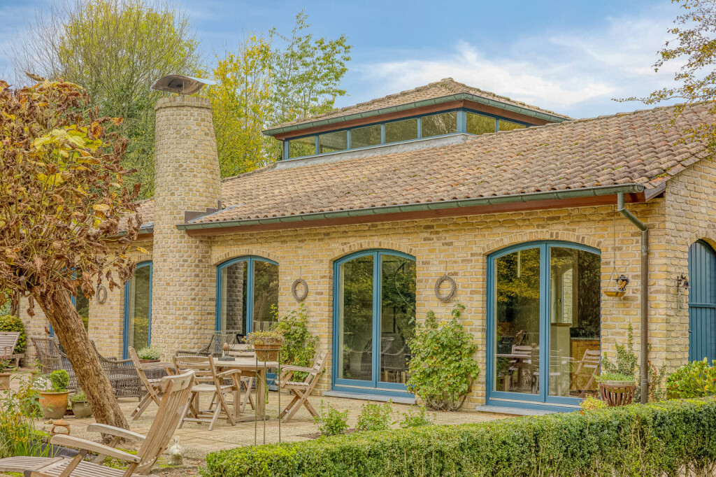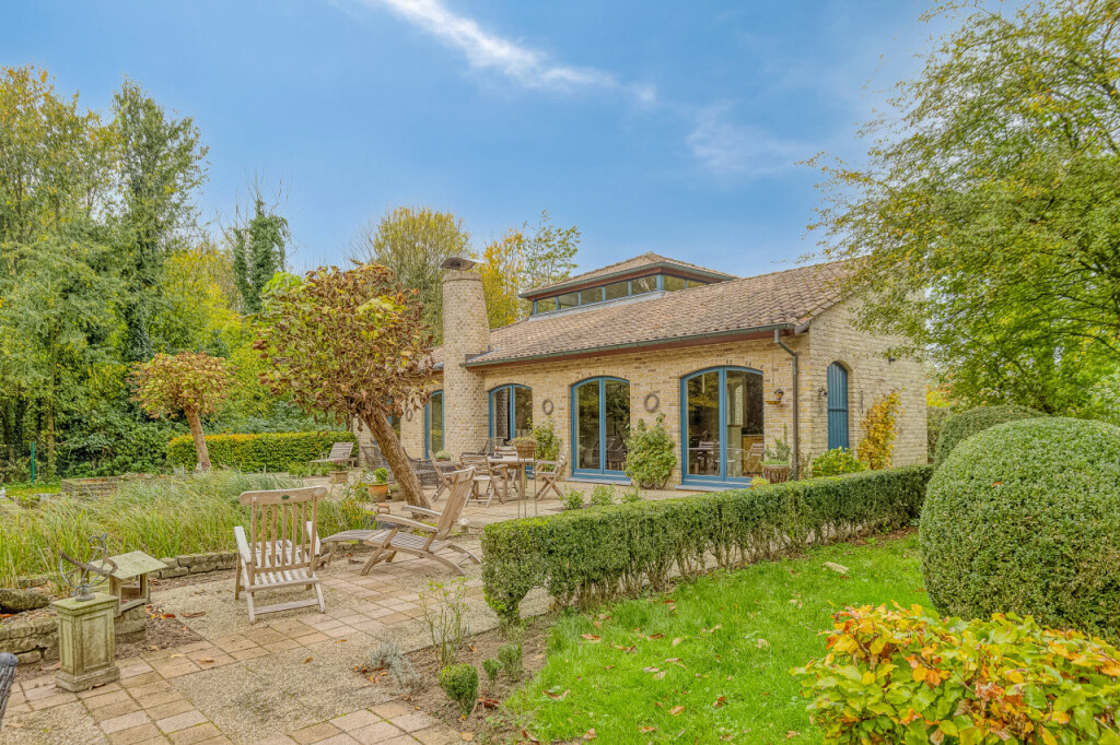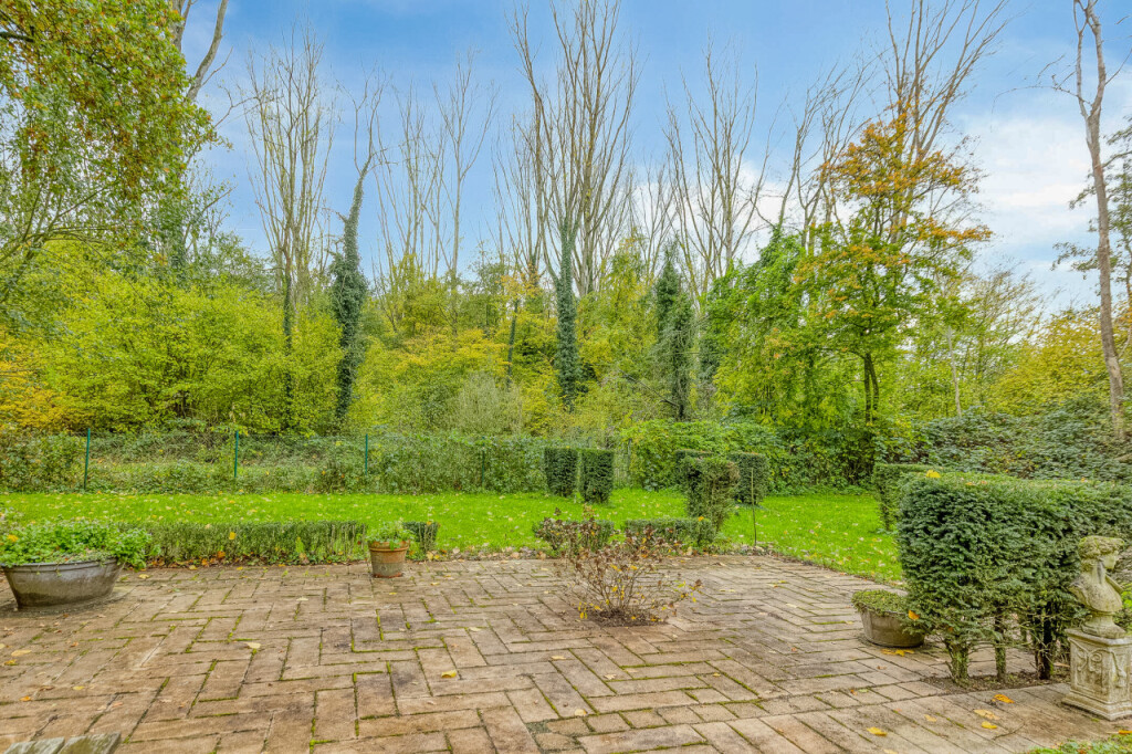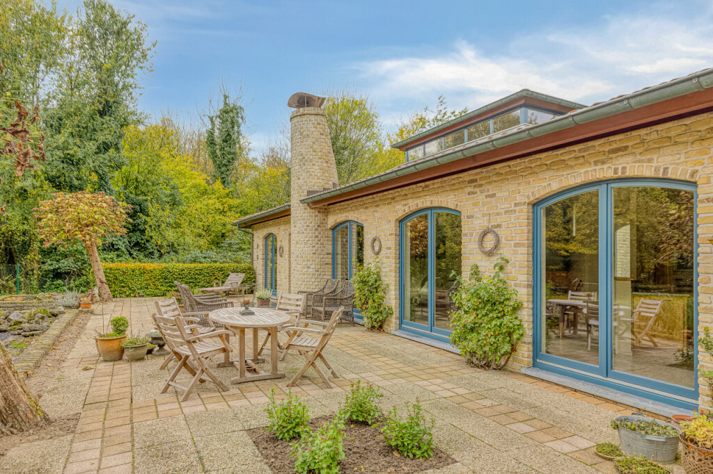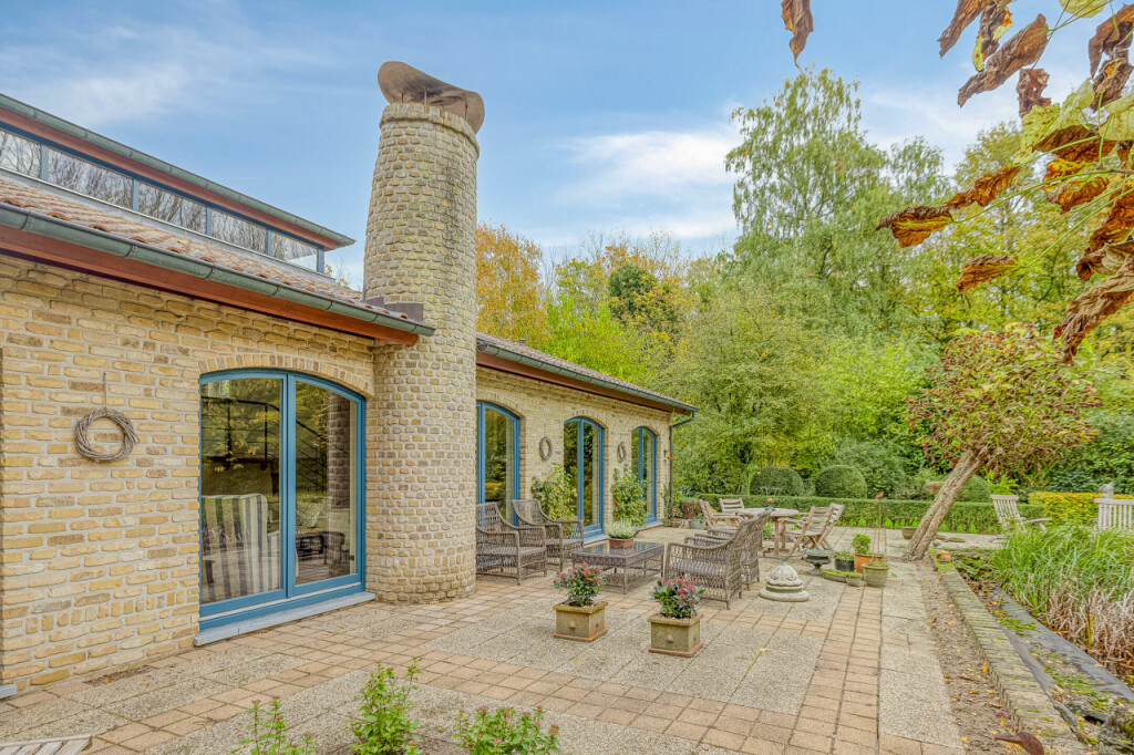 Het grote terras biedt een panoramisch uitzicht op de tuin en het bos; de perfecte plek om te genieten van zomerse diners of ontspannen avonden bij zonsondergang.