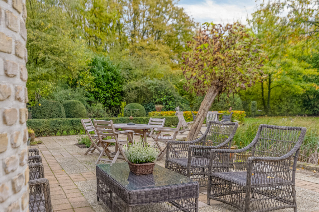 Grenzend aan de woning is er een heerlijk ruim terras vanwaar u prachtig zicht heeft op de tuin en het achterliggende bos. Hier is het optimaal genieten van de rust en de geluiden van de natuur.