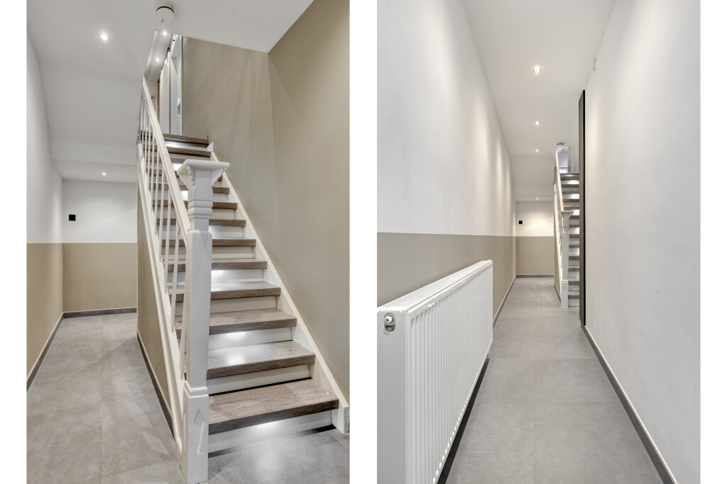 Vanuit de hal heb je toegang tot de kelder en via een stalen deur bereik je de woonkamer, keuken, bijkeuken, toilet en serre.