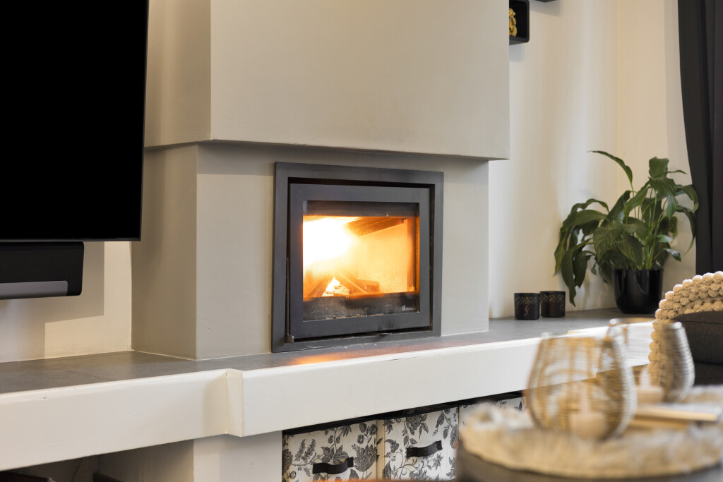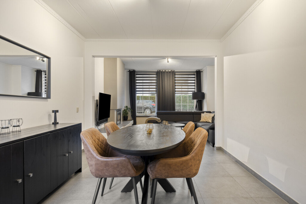 De woonkamer is voorzien van een tegelvloer en rolluiken en heeft een zitgedeelte aan de voorzijde en waar de sfeervolle houtkachel voor behaaglijke warmte zorgt. Het eetgedeelte is aan de achterzijde, aangrenzend aan de keuken.