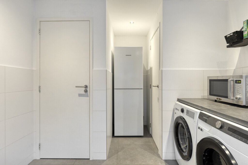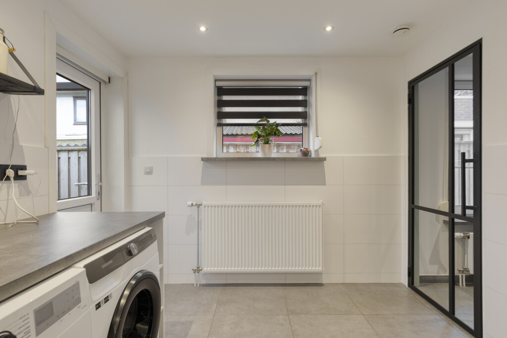 De bijkeuken is half betegeld en voorzien van inbouwspots, de aansluiting voor de wasapparatuur en biedt volop ruimte voor het stallen van een extra koelkast of vriezer. Tevens is hier de c.v.-ketel gesitueerd en nog extra bergruimte. Via de deur is de serre bereikbaar.