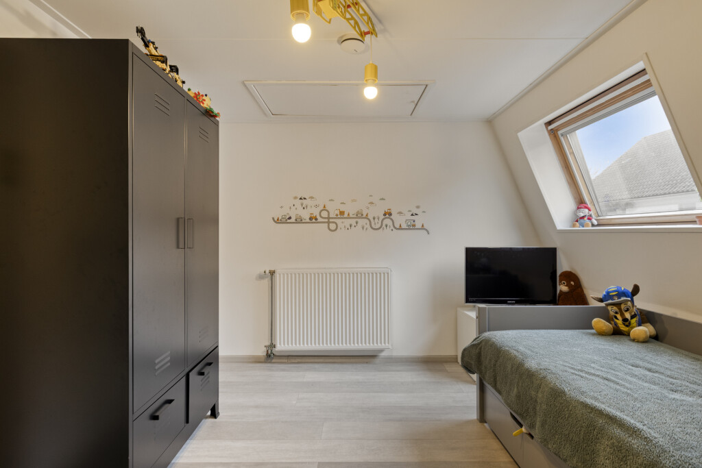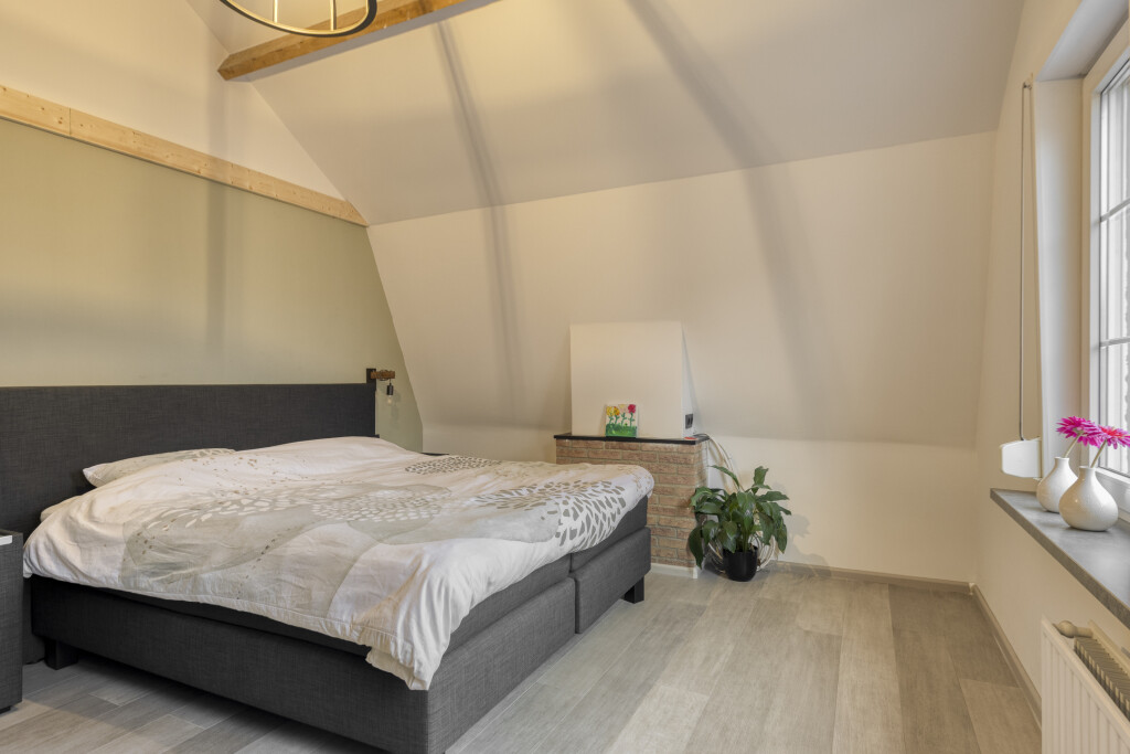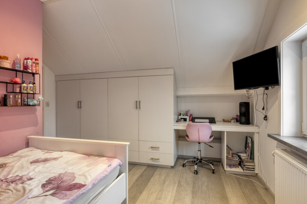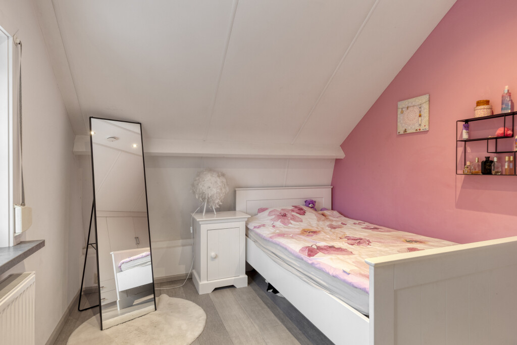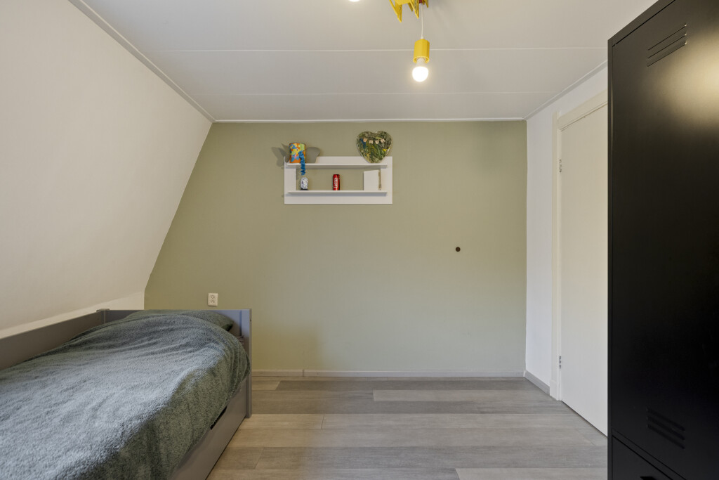 De overloop en slaapkamers zijn voorzien van een laminaatvloer en rolluiken. De master slaapkamer is gelegen aan de voorzijde van de woning en is ruim van formaat. De 2e slaapkamer is voorzien van een dakraam en vanuit hier is de bergzolder bereikbaar. De 3e slaapkamer is voorzien in de uitbouw en heeft een vaste kast.
