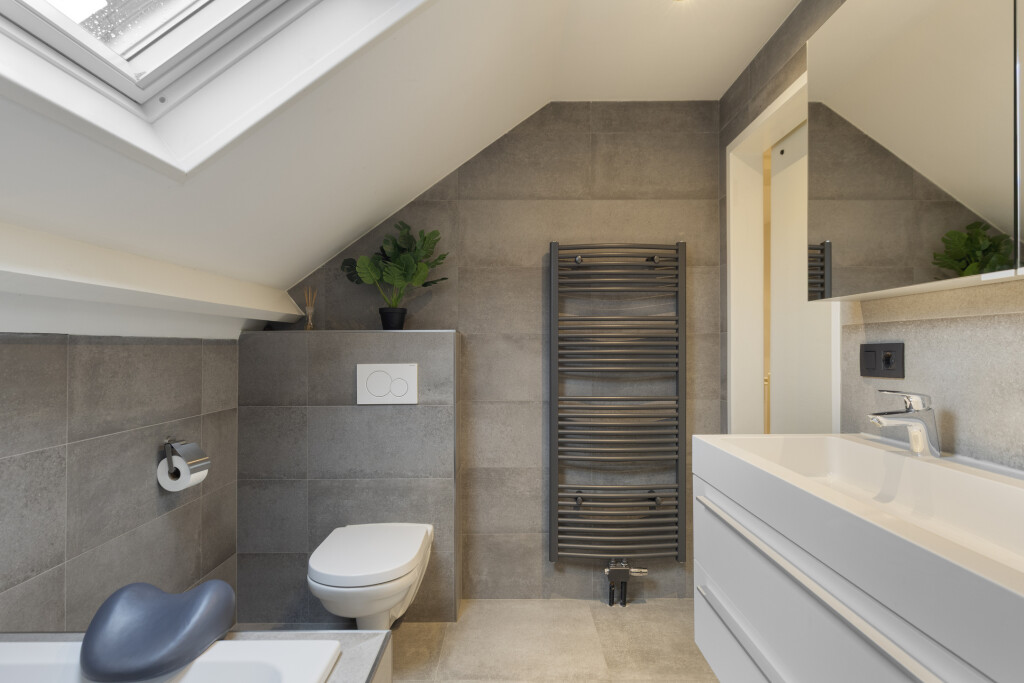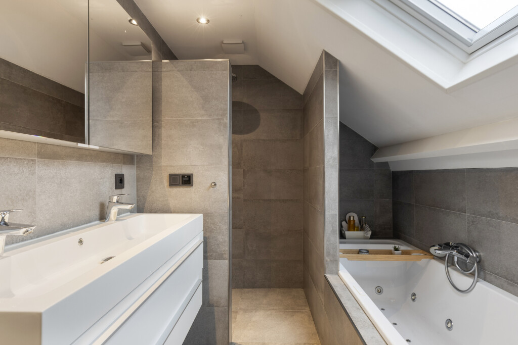 De badkamer is geheel betegeld en voorzien van inbouwspots en een dakraam, een inloopdouche, een bubbelbad, dubbele wastafel met meubel, hangtoilet en designradiator.