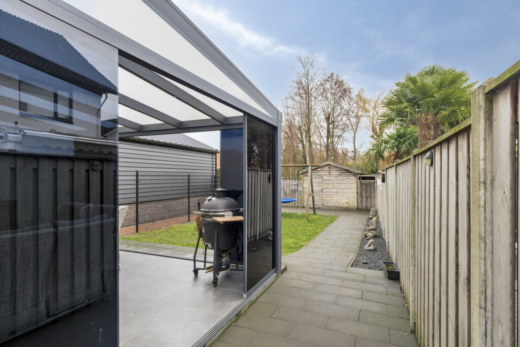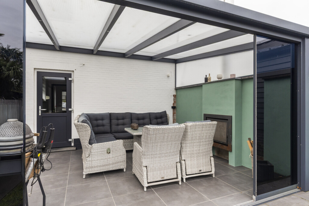 De aluminium serre (391cm*400cm) is in 2018 geplaatst en is voorzien van een betonvloer met tegelvloer, inbouwspots, zonwerend glas en een houtkachel, zodat het er ook in de winter aangenaam warm is. De glazen panelen zijn in de zomer volledig open te schuiven, zodat er directe aansluiting met de tuin ontstaat.