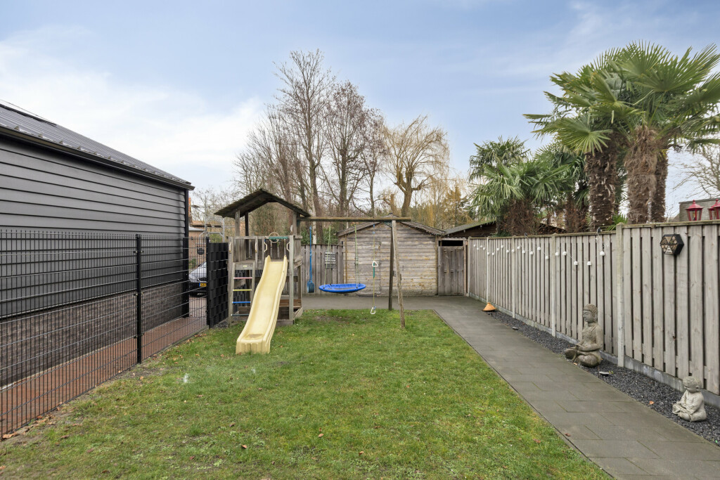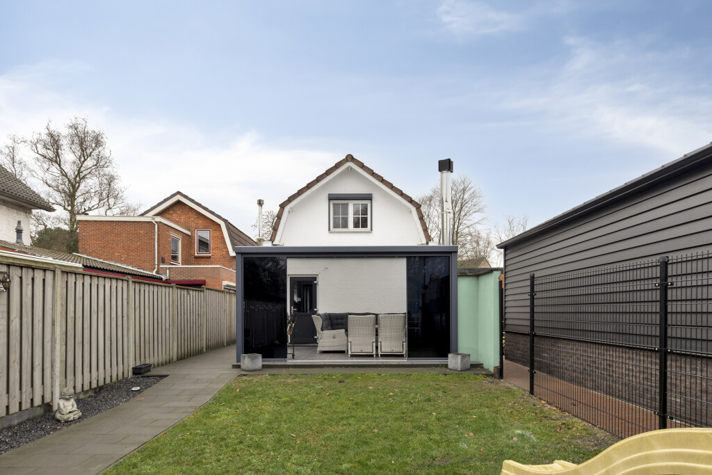 De achtertuin is gesitueerd op het noordwesten en is voorzien van gazon, een tegelpad naar de vrijstaande garage en een achterom. Via de achterliggende straat is het mogelijk om de auto op eigen terrein te parkeren.