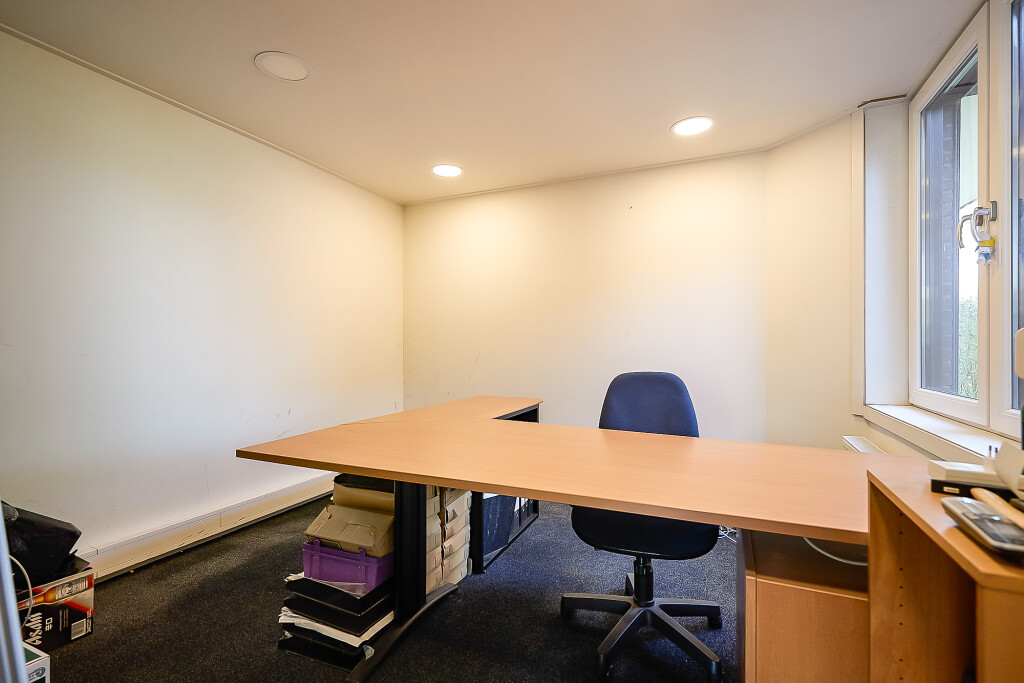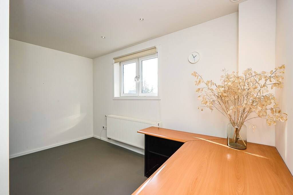 Entree in een ruime kamer/hal vanwaar er toegang is tot een kantoorruimte en een deur naar een kleine berging met deur naar de tuin.