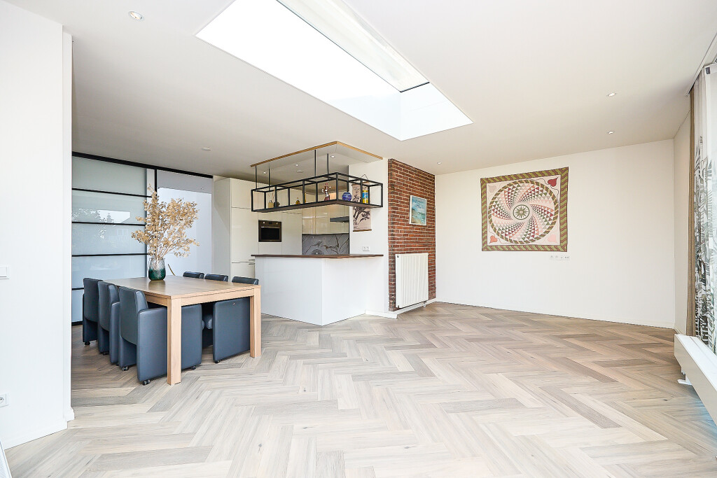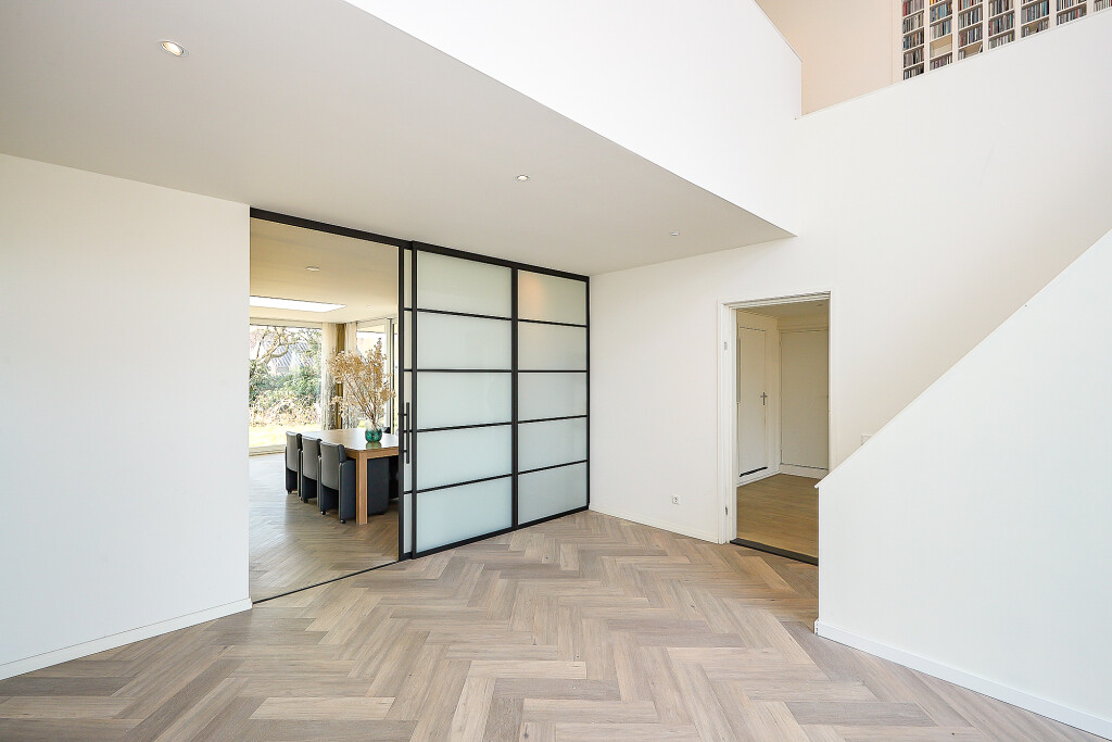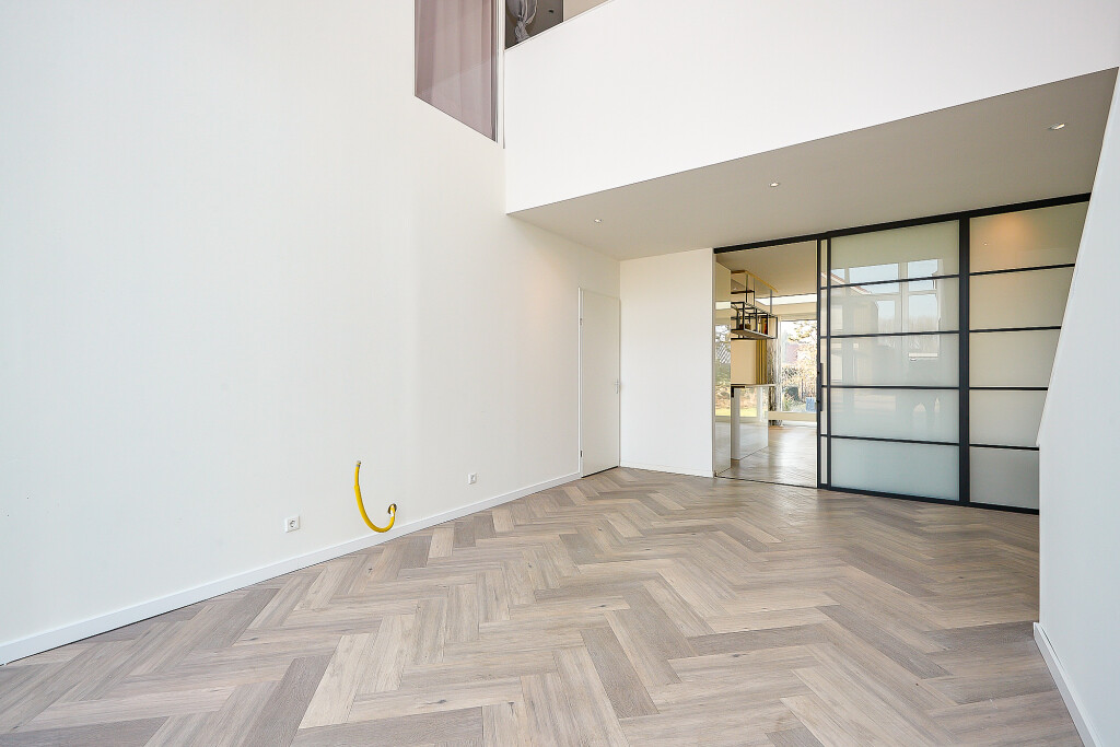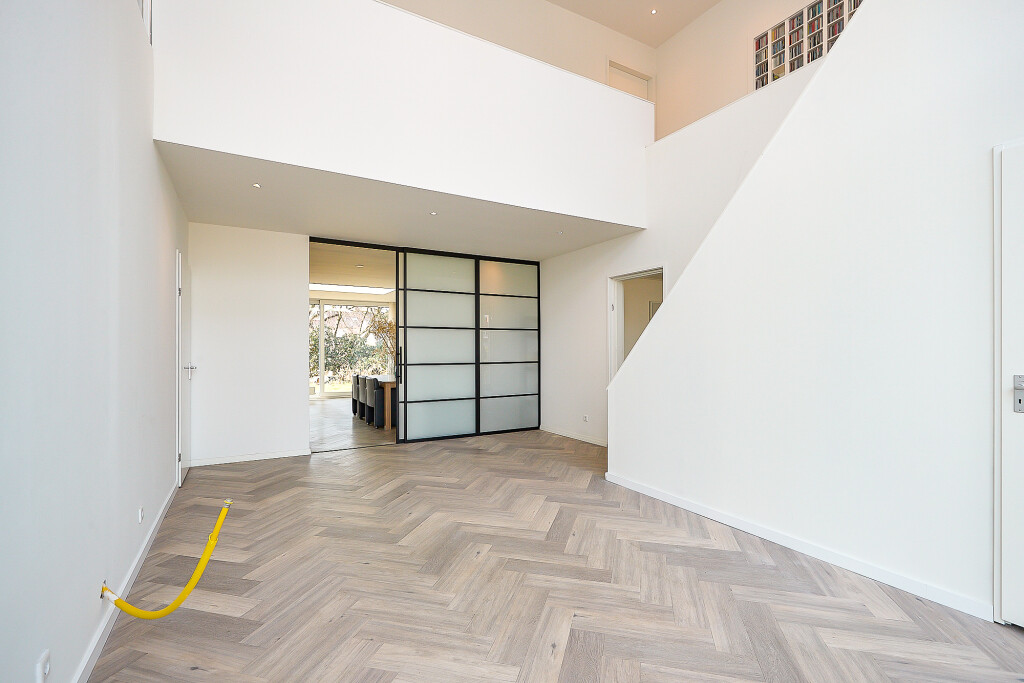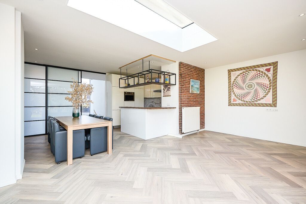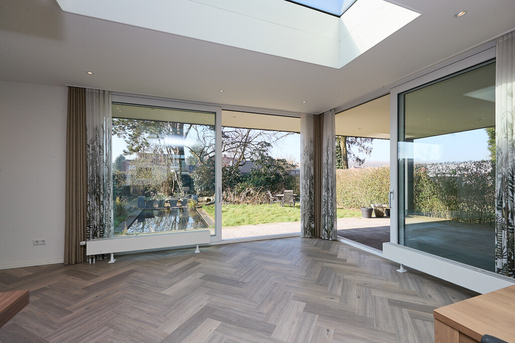 Prachtige, ruime woonkamer met zeer hoge en opvallende raampartijen en fraaie hoge plafonds en vide. In de woonkamer een trap naar de verdieping. En suite aan de woonkamer is er aan de achterzijde van de woning een ruime uitgebouwde leefkeuken met grote lichtkoepel. De keuken heeft een U-opstelling met een Smeg kookfornuis, afzuigkap, koelkast, vaatwasser en magnetron. Vanuit de keuken zijn er 2 grote schuifpuien naar een overdekt terras met prachtig zicht op de tuin.