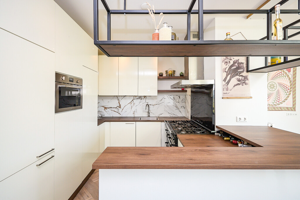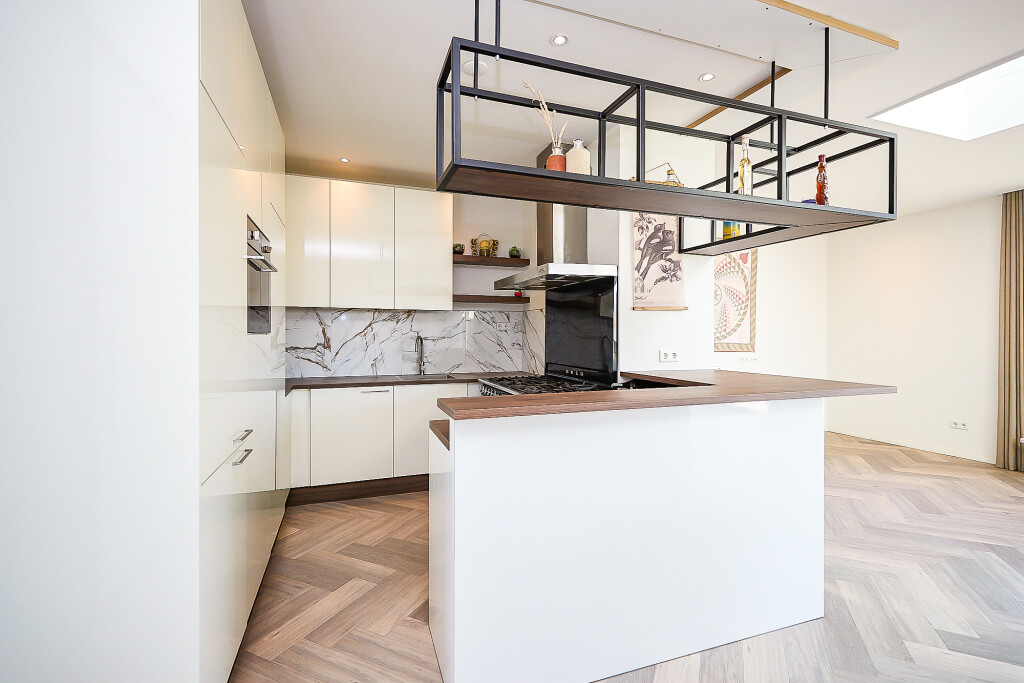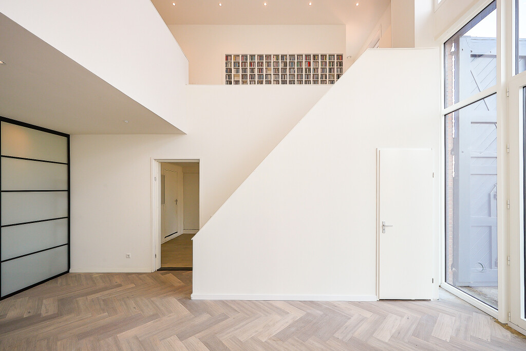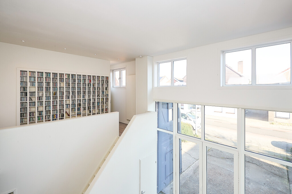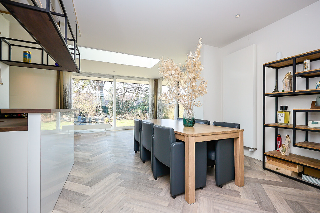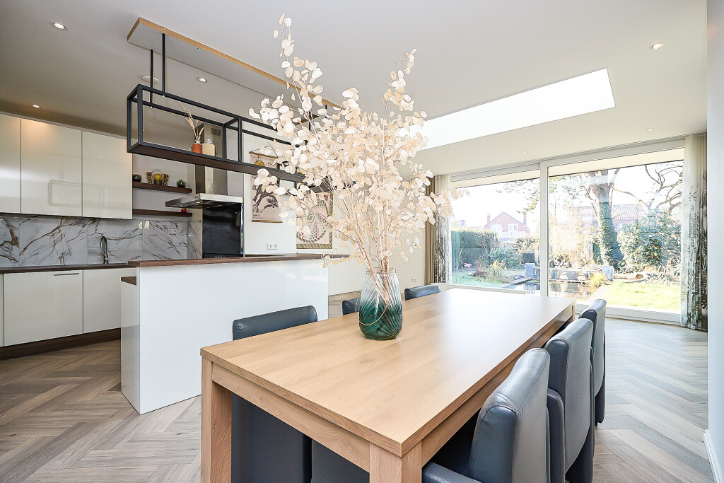Prachtige, ruime woonkamer met zeer hoge en opvallende raampartijen en fraaie hoge plafonds en vide. In de woonkamer een trap naar de verdieping. En suite aan de woonkamer is er aan de achterzijde van de woning een ruime uitgebouwde leefkeuken met grote lichtkoepel. De keuken heeft een U-opstelling met een Smeg kookfornuis, afzuigkap, koelkast, vaatwasser en magnetron. Vanuit de keuken zijn er 2 grote schuifpuien naar een overdekt terras met prachtig zicht op de tuin.