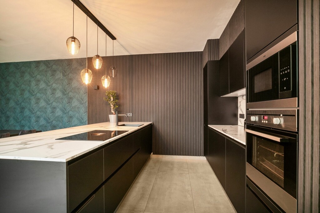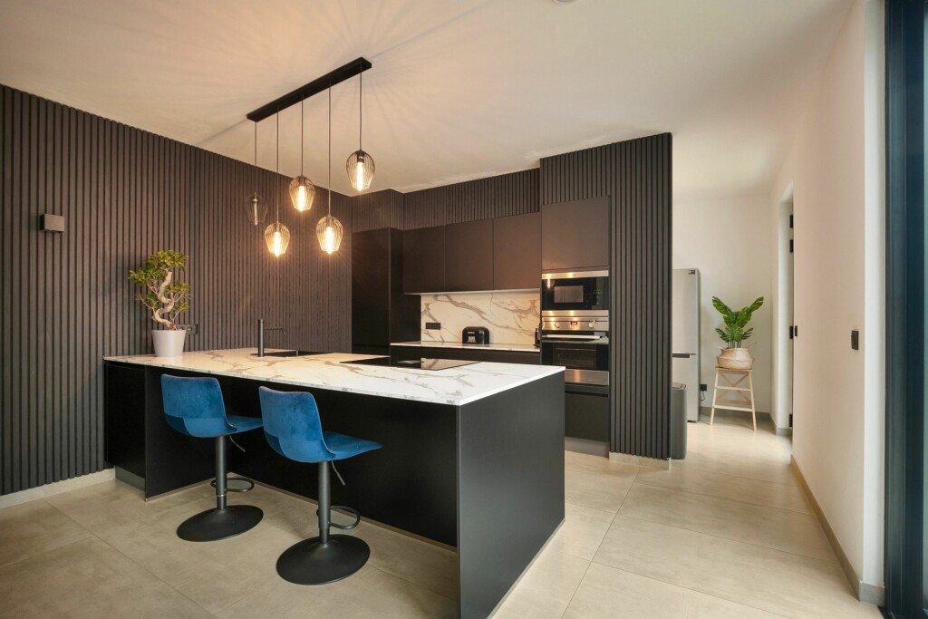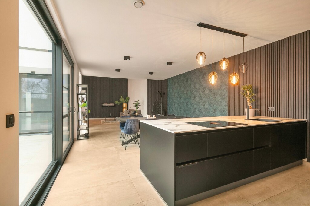 Aansluitend aan de woonkamer is de grote luxe leefkeuken opgesteld in een rechte wandopstelling met schiereiland. De keuken is uitgerust met alle benodigde inbouwapparatuur waaronder;