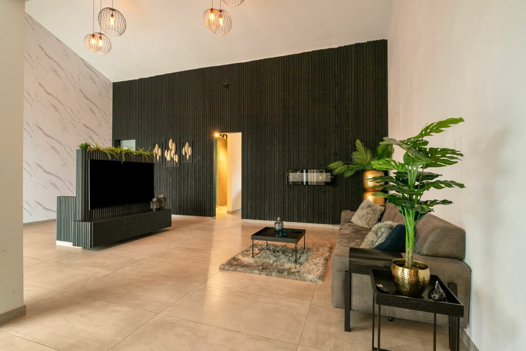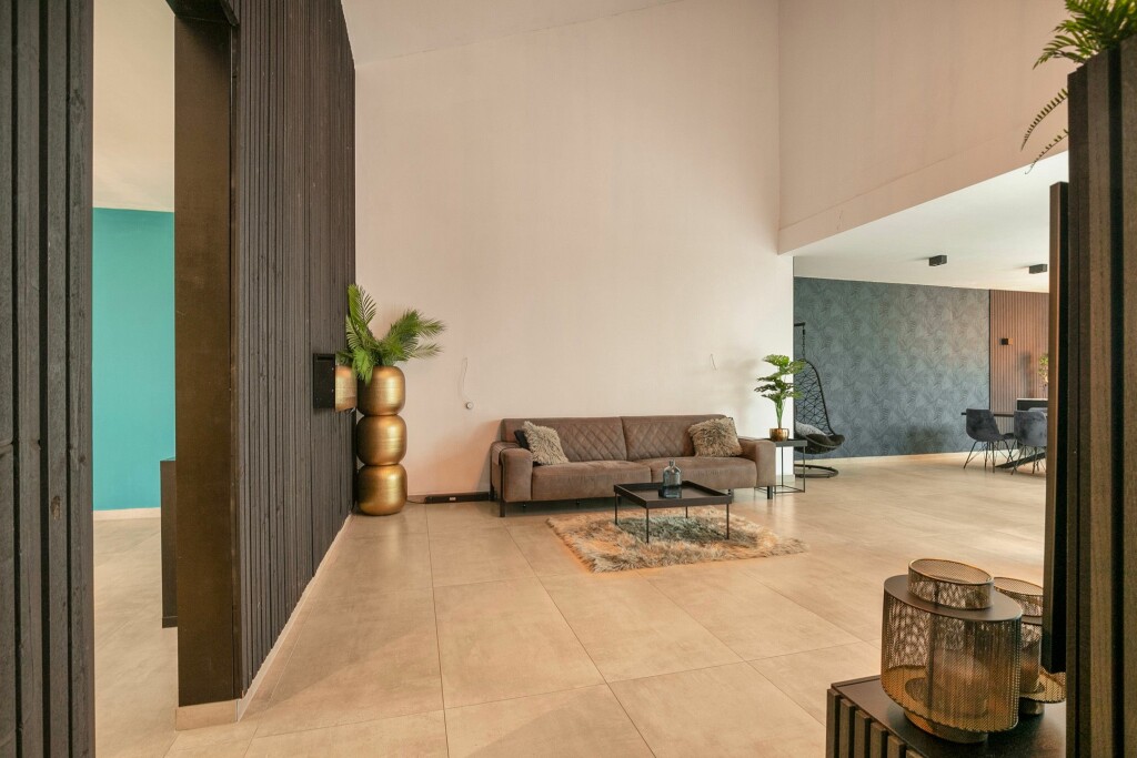 De riante woonkamer met vide heeft grote raampartijen met een schuifdeur naar het terras. Hier is plek voor een ultra grote loungebank. Het middenconsole biedt de mogelijkheid voor een tv-scherm om uitgebreid te ontspannen na een drukke week. De warme kleuren die gebruikt zijn op vloeren en wanden zijn perfect te combineren met de hedendaagse interieurstijlen.