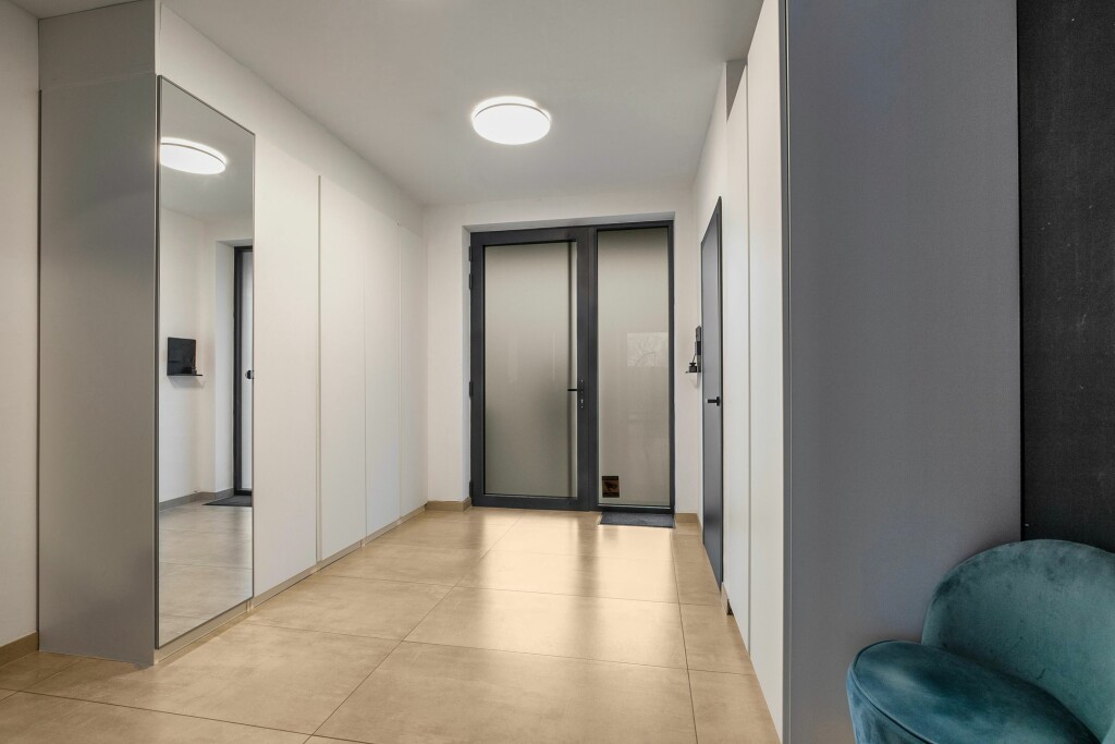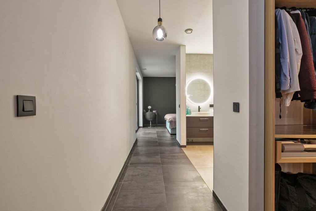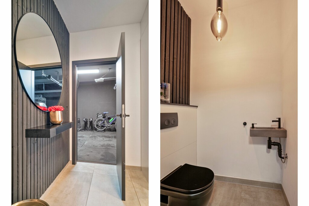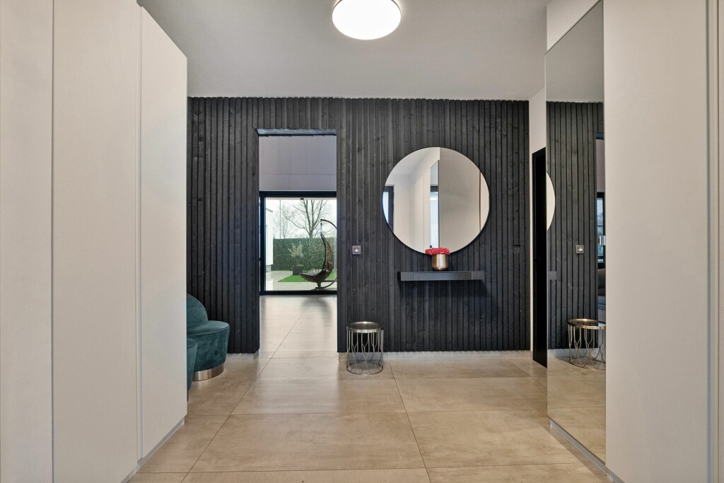Royale entree met aan twee zijden ruime ingebouwde garderobekasten. In de hal bevindt zicht tevens het luxe toilet met fontein en de meterkast. Vanuit de entree zijn de woonkamer en de garage te bereiken.