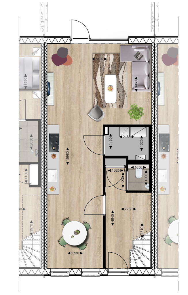 Binnenkomst via hal met toilet, meterkast en vaste trap naar de verdieping. Vanuit de hal betreed je de woonkamer met in het middenstuk de mogelijkheid voor de keuken. Logischerwijs kies je in deze woning voor een zithoek aan de achterkant van de woning en plaats je de eethoek aan de voorzijde met daartussen de mogelijkheid voor de keuken. Achter de keuken zit de bijkeuken/technische ruimte. Naast de warmtepomp en de WtW heb je hier plaat voor de wasmachine.