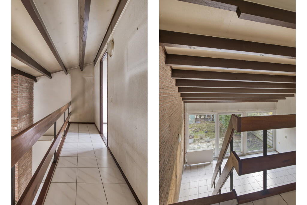 De verdieping is bereikbaar via de trap in de woonkamer. Hier komt u uit op de vide (overloop), die toegang biedt tot twee slaapkamers.