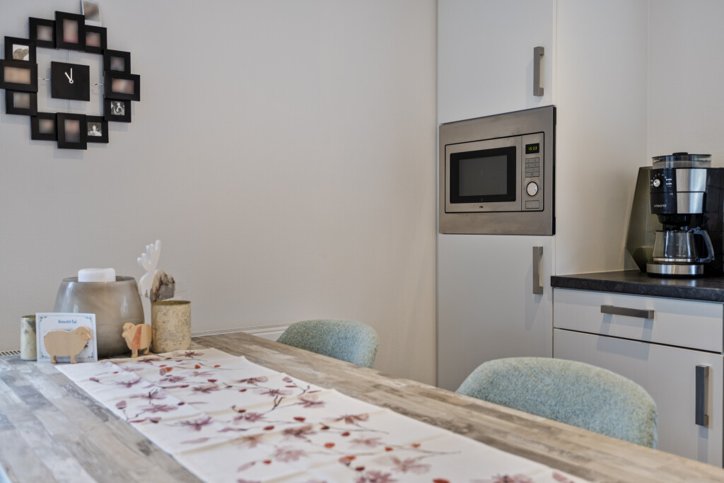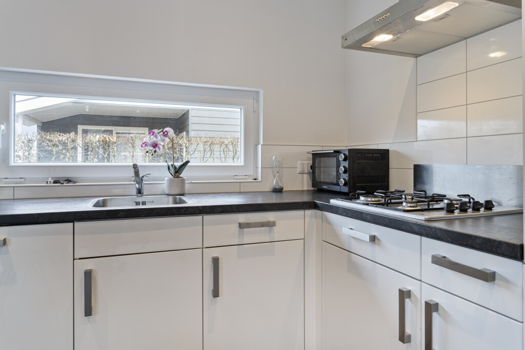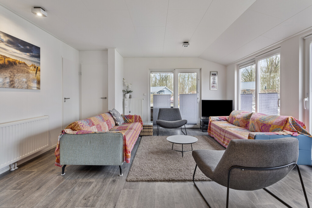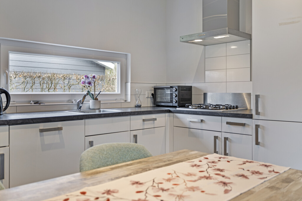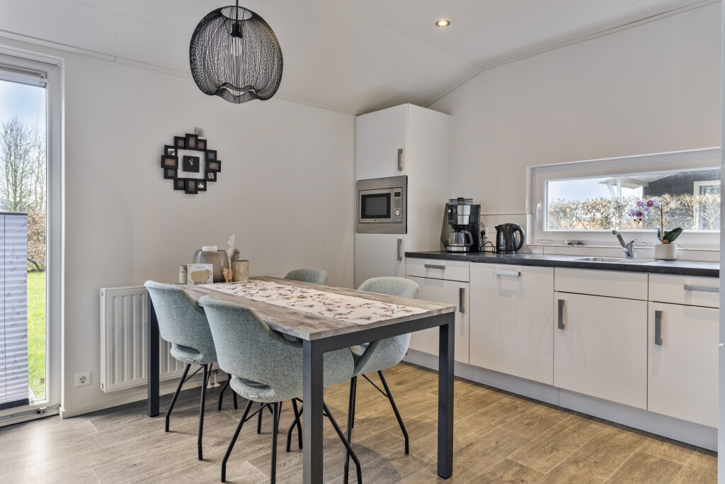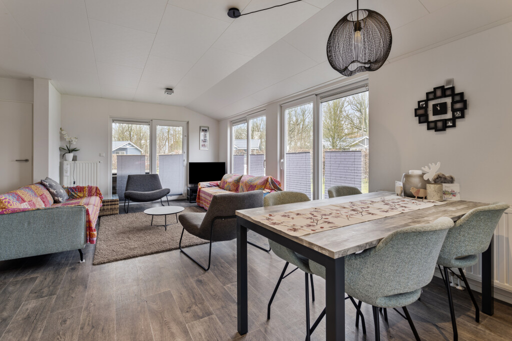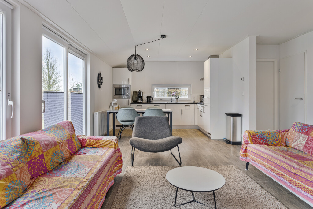 Bij binnenkomst in de bungalow kom u in de hal, waar zich de meterkast en toiletruimte bevinden. Vanuit de hal heeft u toegang tot de ruime woonkamer, die beschikt over een open inbouwkeuken. Deze keuken is compleet uitgerust met een 4-pits gaskookplaat, afzuigkap, combi-oven, koelkast, diepvries en een vaatwasser. De woonkamer heeft daarnaast een schuifpui, die toegang biedt tot het terras.