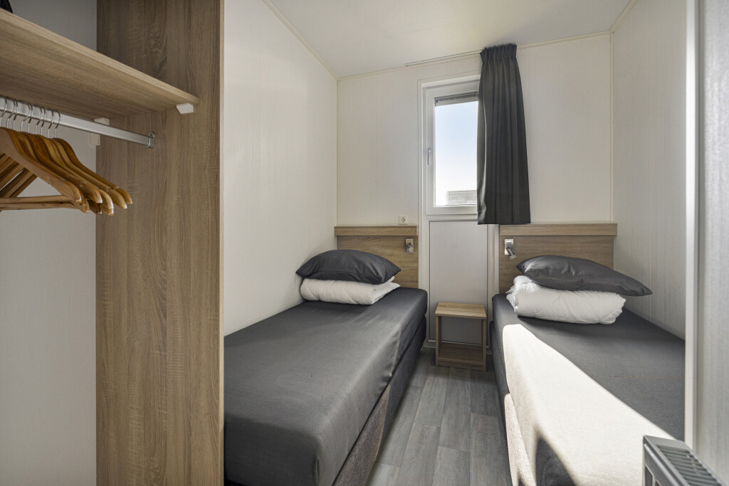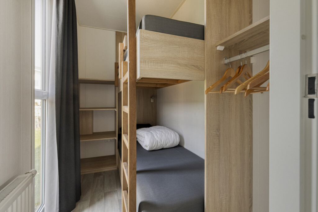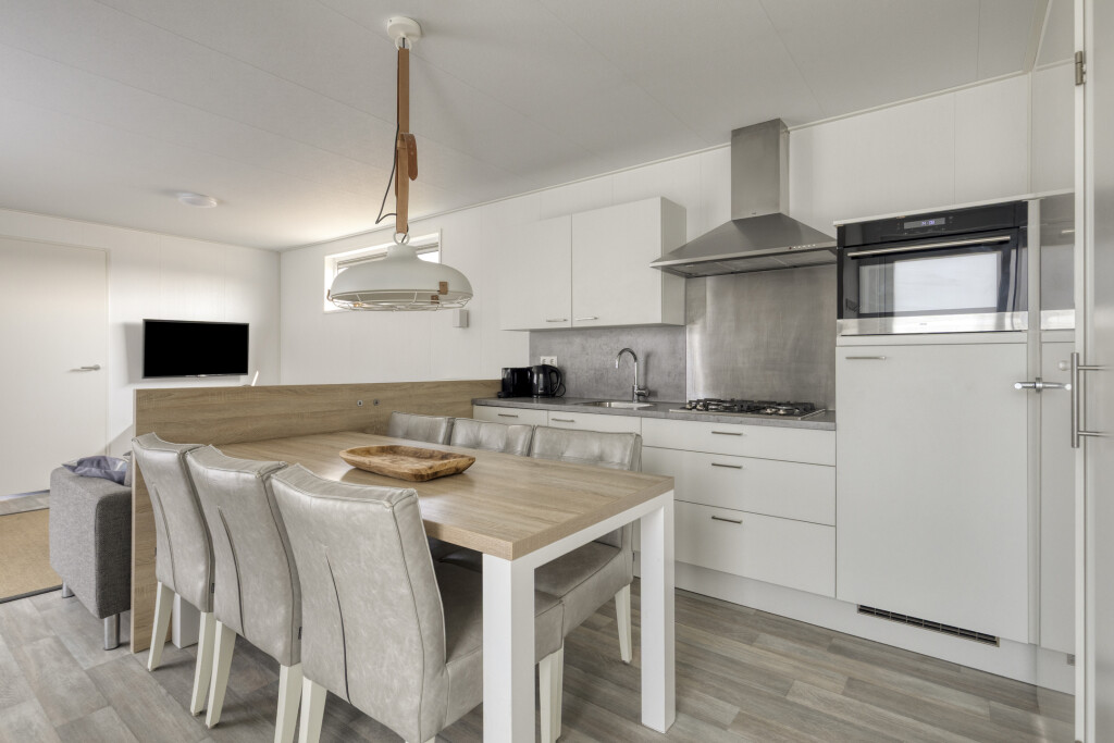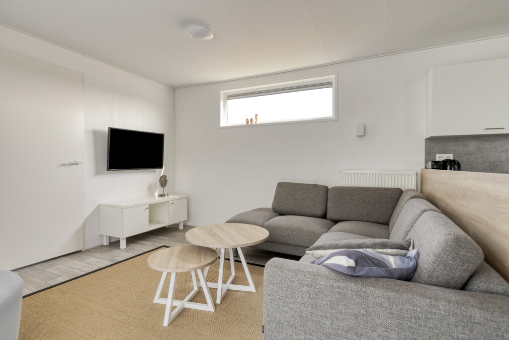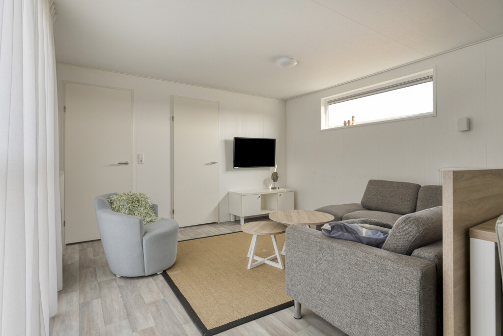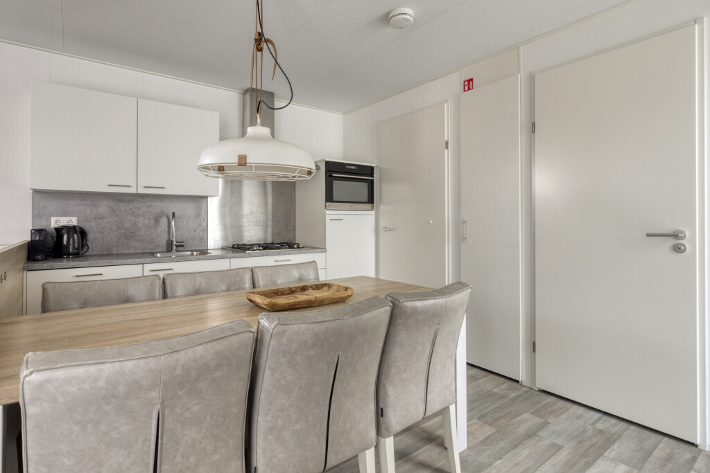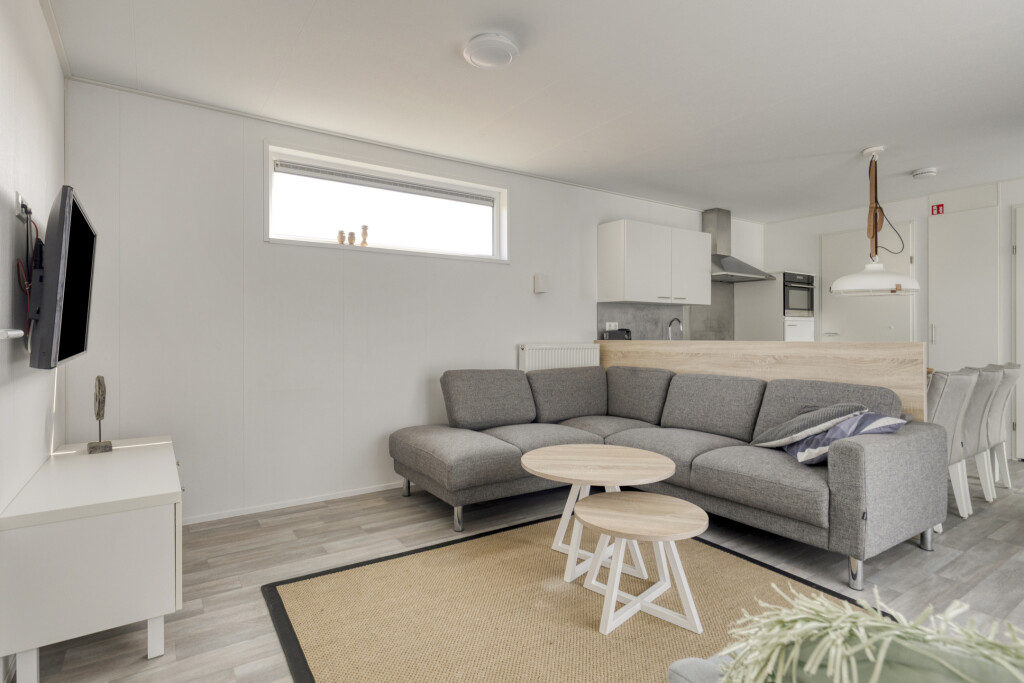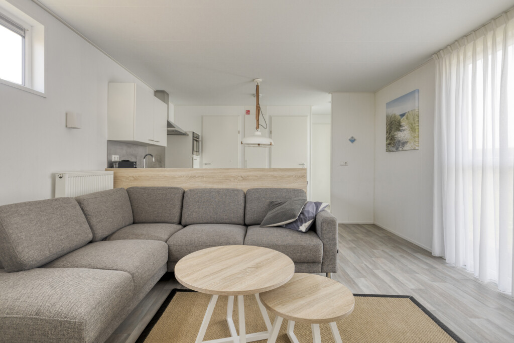 Bij binnenkomst in de woning ervaart u direct de aangename lichtinval. De lichte woonkamer vormt het hart van het huis en staat in open verbinding met de moderne keuken. De keuken is van alle gemakken voorzien om uitgebreid te koken na een dag op het strand, inclusief een 4-pits gaskookplaat, oven, vaatwasser en een koel-vriescombinatie. De slimme indeling biedt ruimte aan drie slaapkamers, waardoor de woning uitermate geschikt is voor gezinnen. Eén van de kamers is praktisch ingericht met een stapelbed, ideaal voor de kinderen. De nette badkamer beschikt over een inloopdouche en een stijlvol wastafelmeubel. Voor extra comfort is er een separate toiletruimte aanwezig.