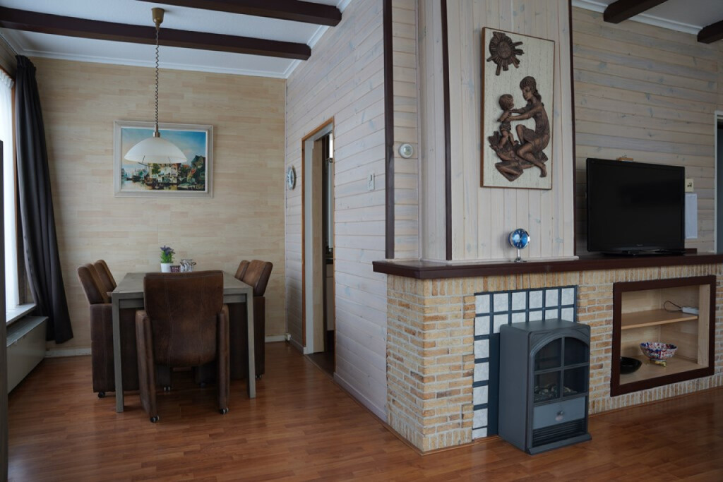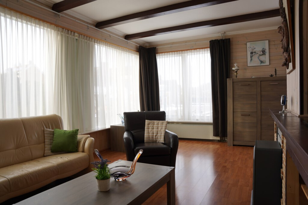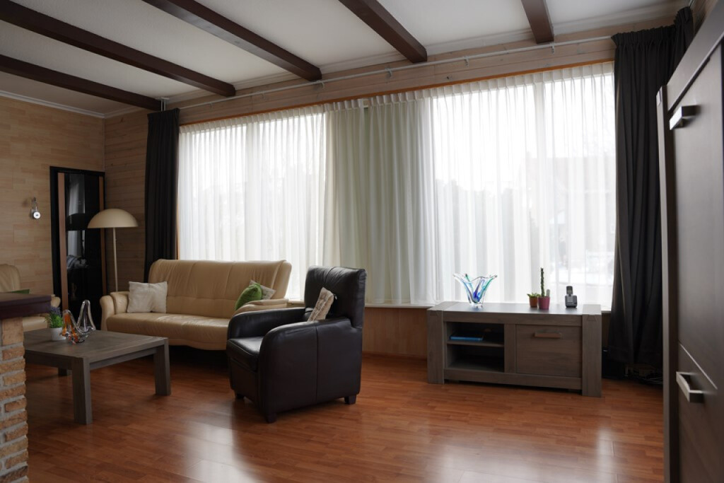 Vanuit hier loop je door naar de L-vormige woonkamer met laminaatvloer en een sfeervolle sierschouw. Het daglicht valt hier prettig naar binnen en de ruimte voelt open en overzichtelijk aan.