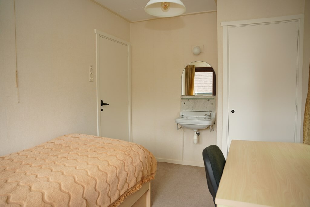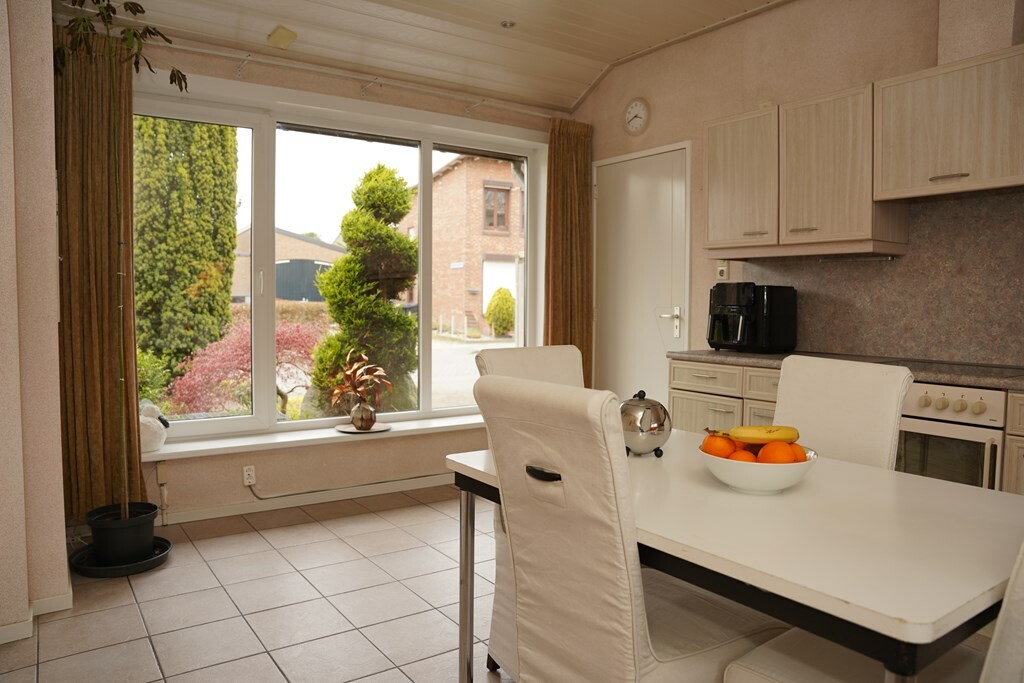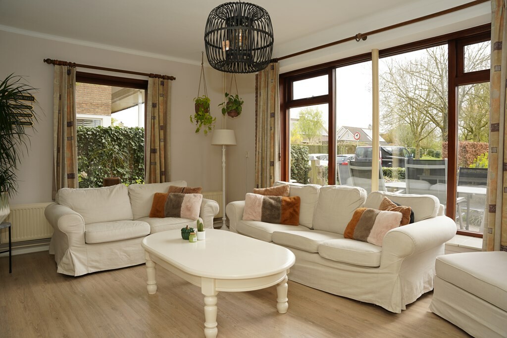 De ruime woonkamer is belegd met een pvc vloer en door de grote raampartijen valt er aangenaam veel daglicht naar binnen. Een vaste kast zorgt voor handige bergruime, terwijl de voormalige schouw zorgt voor extra sfeer in deze ruimte. Via een deur kom je in de voortuin met een gezellig terras op het zuiden.
