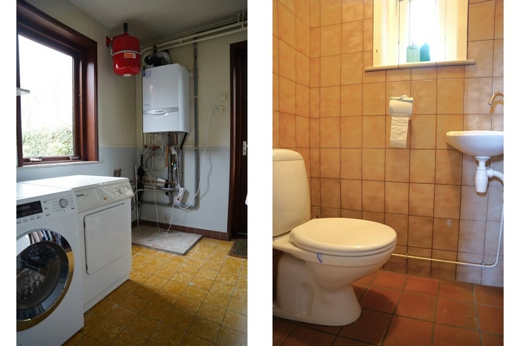 Aan de andere kant van de hal geeft een deur toegang tot de bijkeuken waar de aansluitingen voor de wasmachine en de droger zijn en waar ook de cv ketel staat opgesteld. Ook hier heb je via een buitendeur toegang tot weer een ander deel van de tuin.