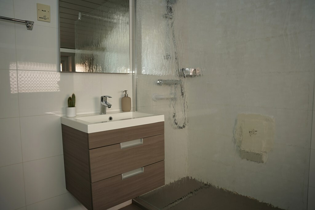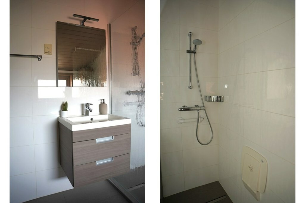 De badkamer dateert van 2016 en is uitgerust met een douche, een 2e toilet, en een wastafelmeubel.