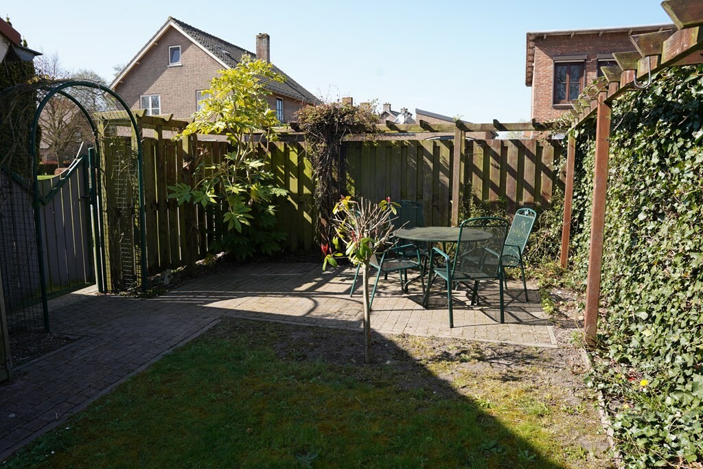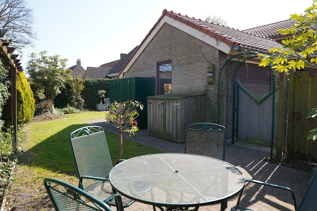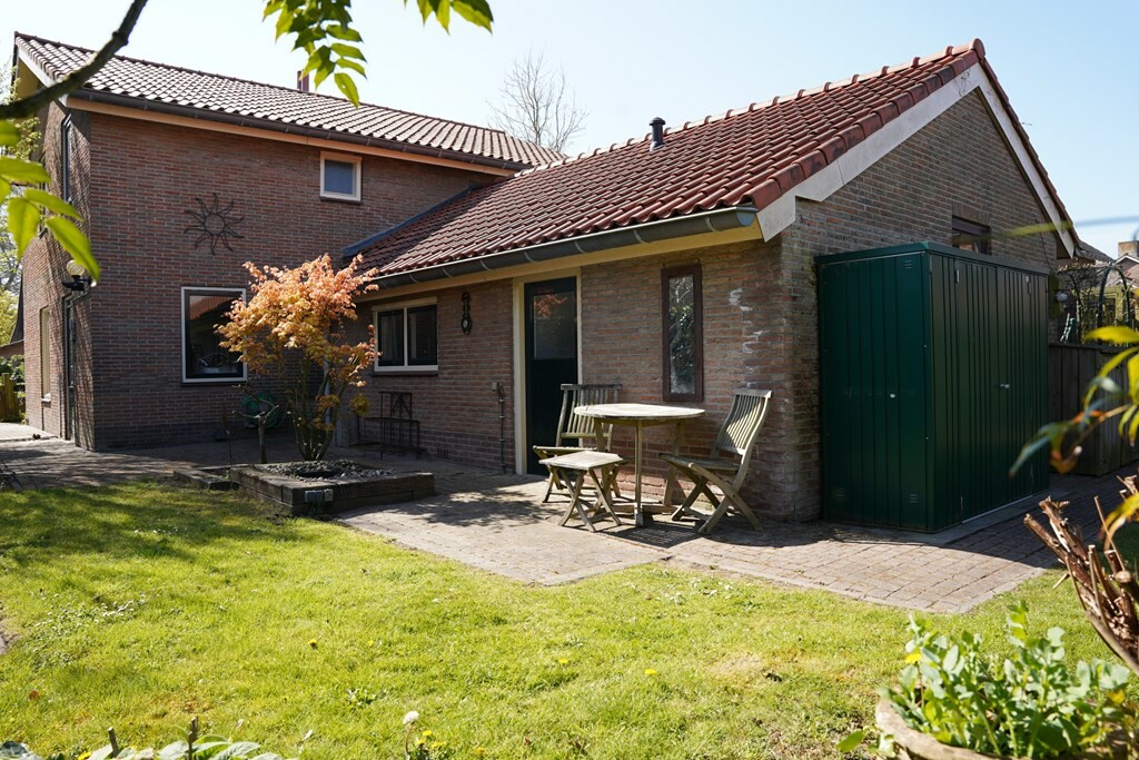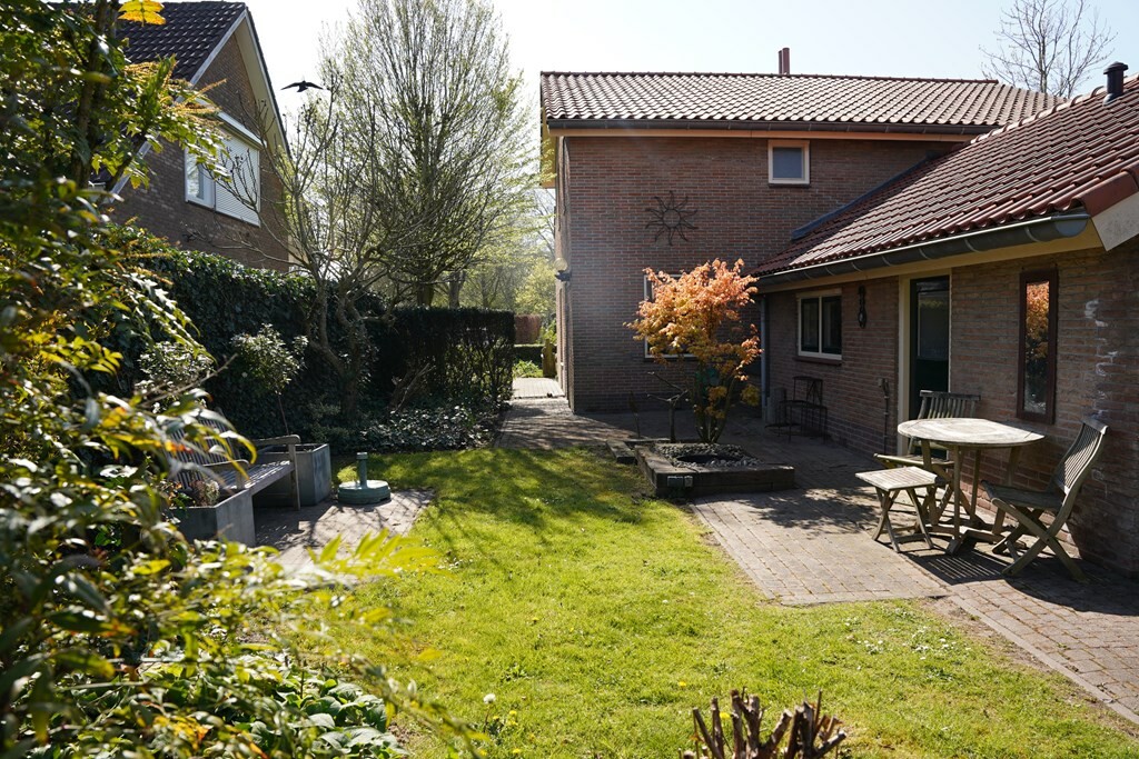 Aan de voorzijde wacht een zonnig terras op het zuiden, compleet met zonnescherm en een sfeervolle vijverpartij. Je kijkt vanaf hier uit op het groen en in de verte het natuurgebied \'t Groote Gat.