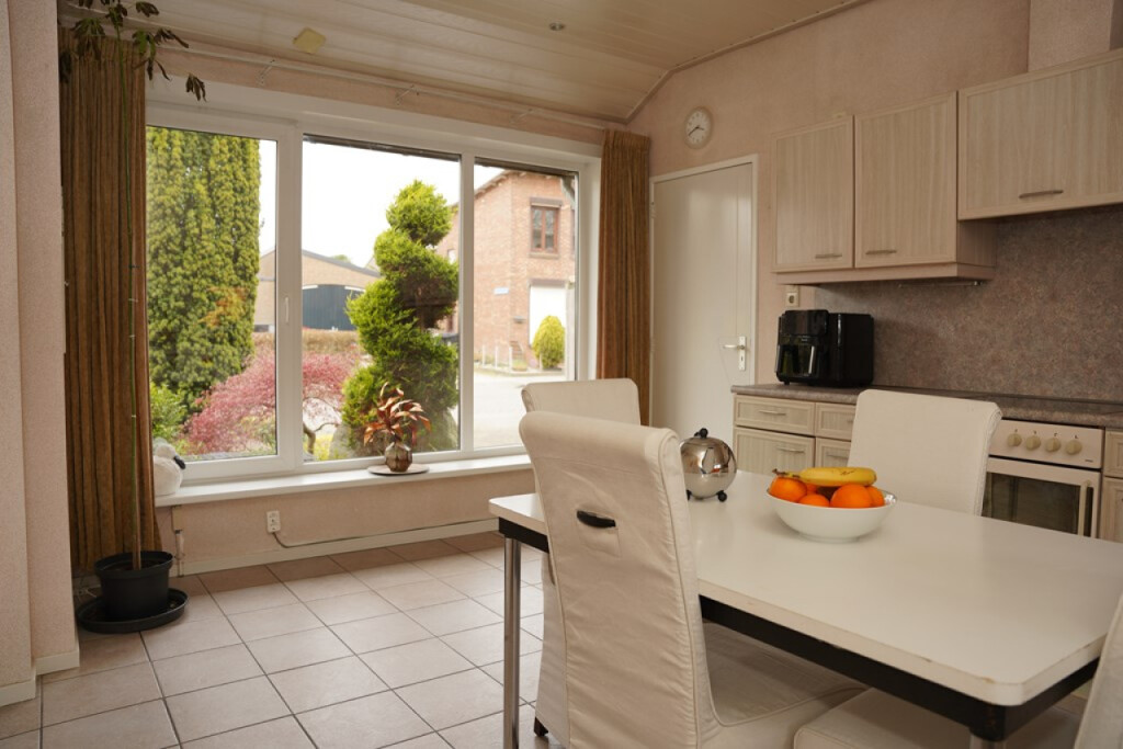 De ruime woonkamer is belegd met een pvc vloer en door de grote raampartijen valt er aangenaam veel daglicht naar binnen. Een vaste kast zorgt voor handige bergruime, terwijl de voormalige schouw zorgt voor extra sfeer in deze ruimte. Via een deur kom je in de voortuin met een gezellig terras op het zuiden.
