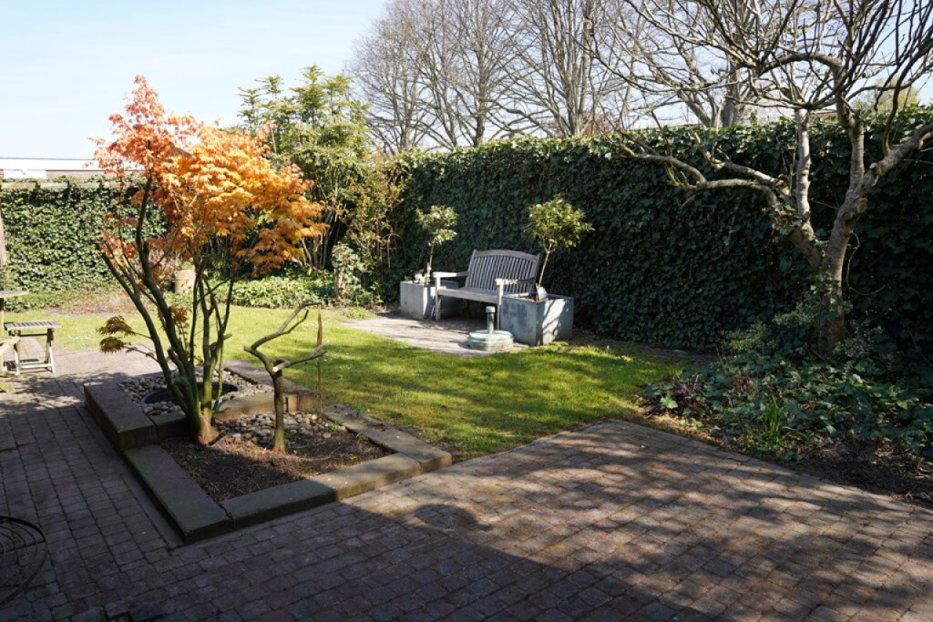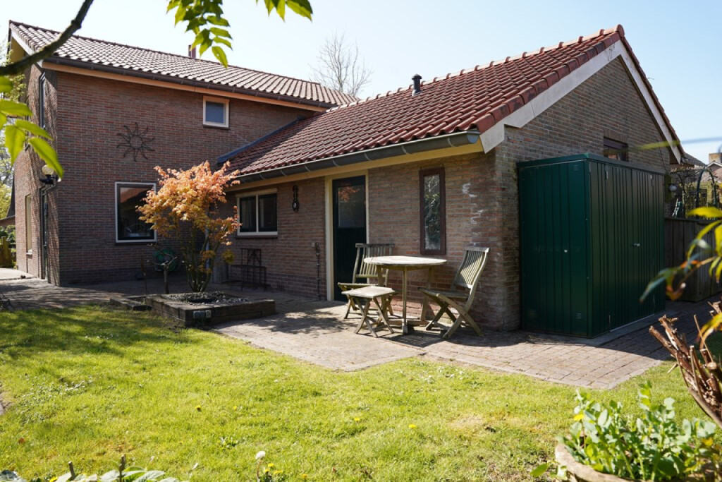 Aan de voorzijde wacht een zonnig terras op het zuiden, compleet met zonnescherm en een sfeervolle vijverpartij. Je kijkt vanaf hier uit op het groen en in de verte het natuurgebied \'t Groote Gat.