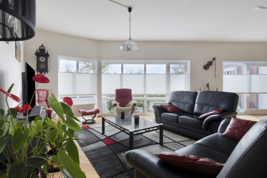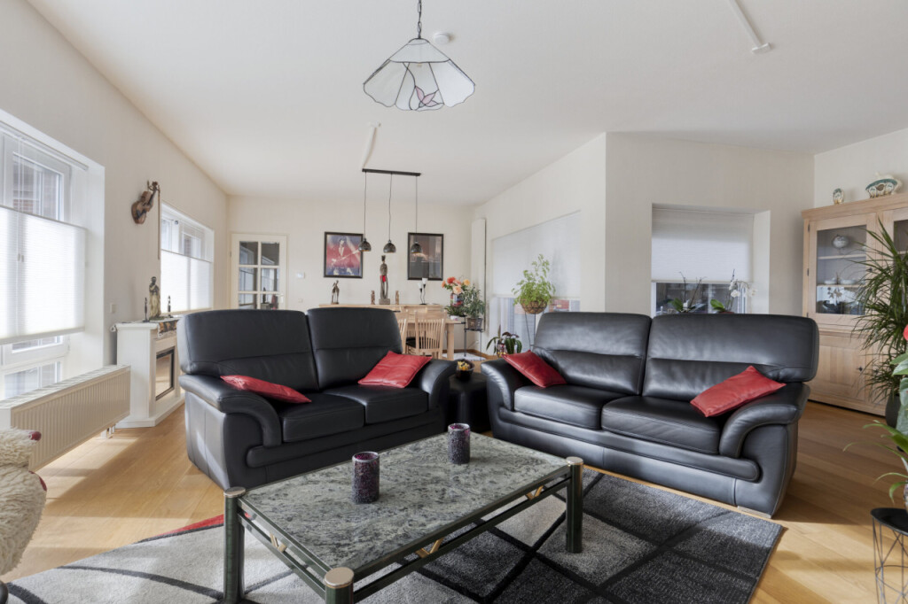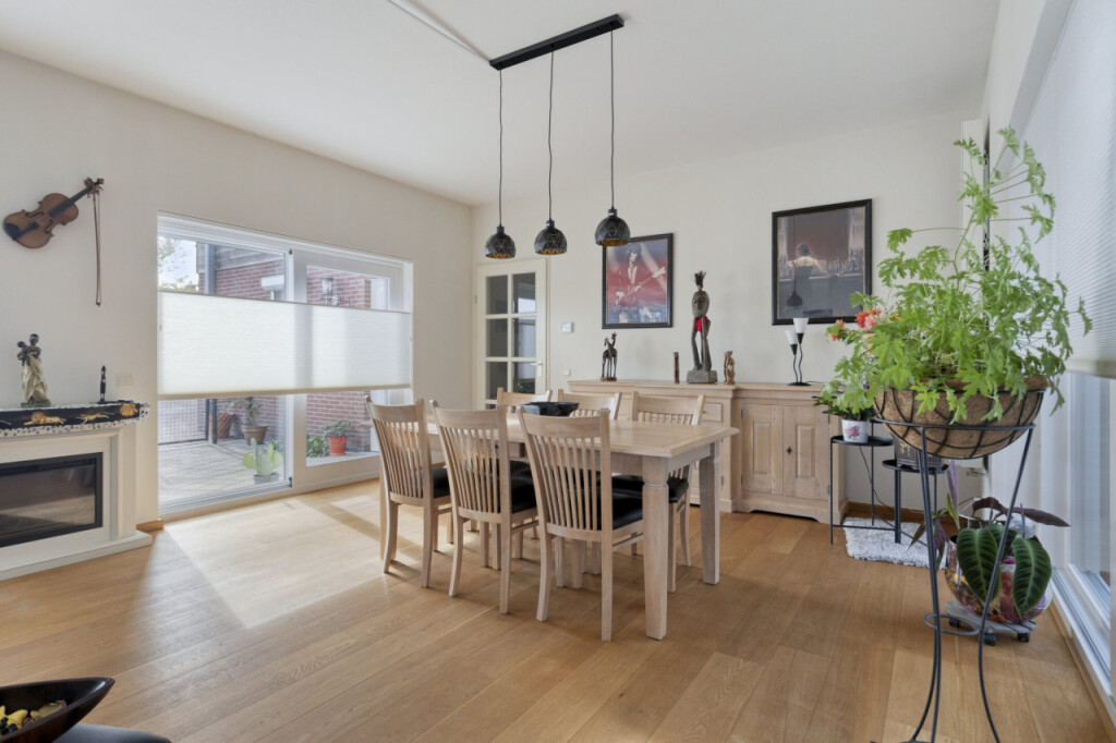 De lichte en royale woonkamer biedt volop leefruimte. De grote raampartijen zorgen voor een fijne lichtinval en een open, ruimtelijk gevoel. In de zomermaanden zet je de schuifdeur open en geniet je van het buitengevoel.