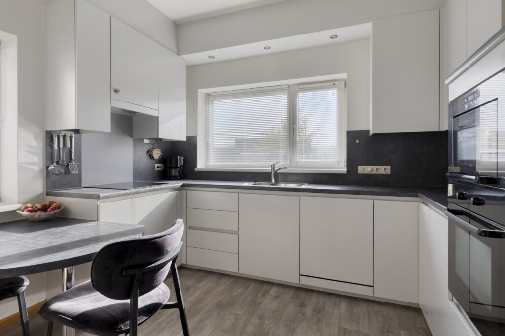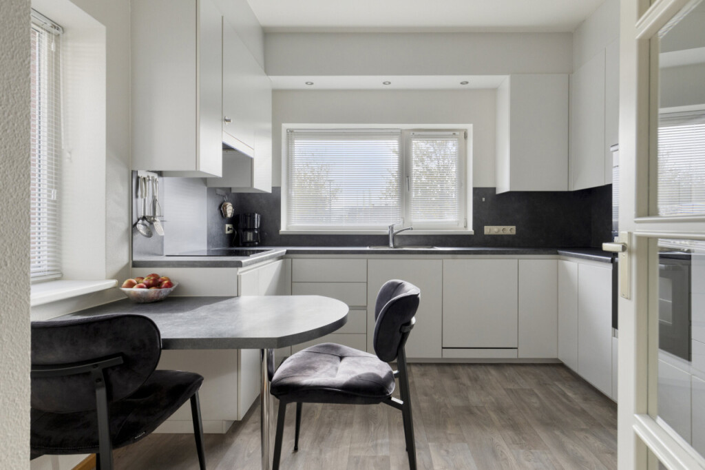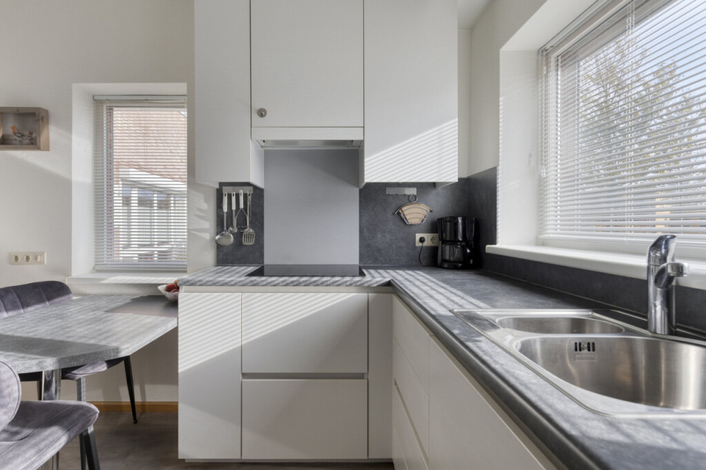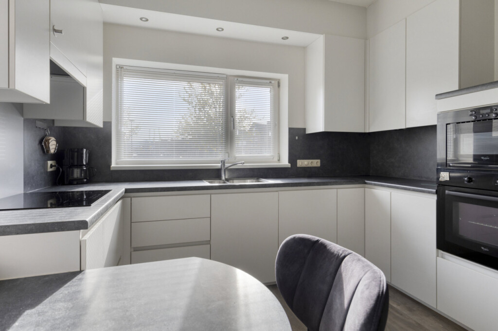 Aan de voorzijde bevindt zich de moderne woonkeuken, voorzien van een tijdloos ontwerp en inbouwapparatuur zoals een inductiekookplaat met afzuiging, vaatwasser, koelkast, oven en magnetron.