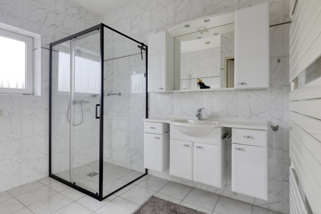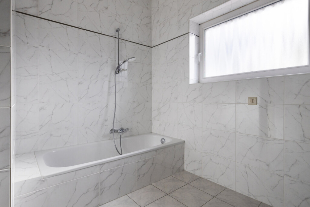 De badkamer is een echte blikvanger: ruim opgezet en afgewerkt met stijlvolle marmeren tegels.