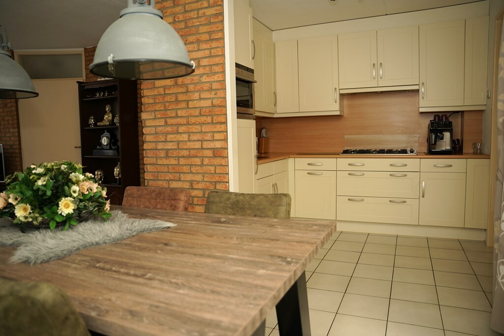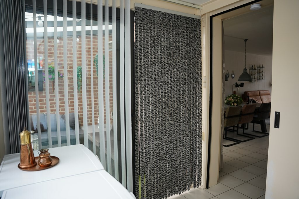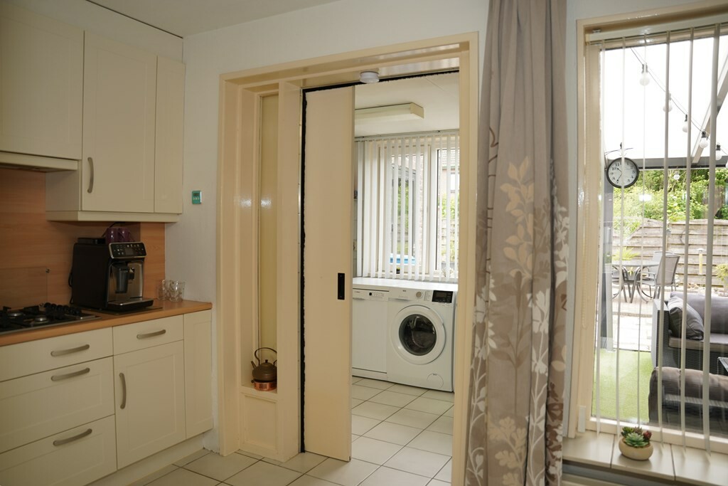 Aangrenzend vind je de bijkeuken waar zich de aansluitingen voor het benodigde witgoed bevinden, evenals de achterdeur die uitkomt in het overdekte terras.