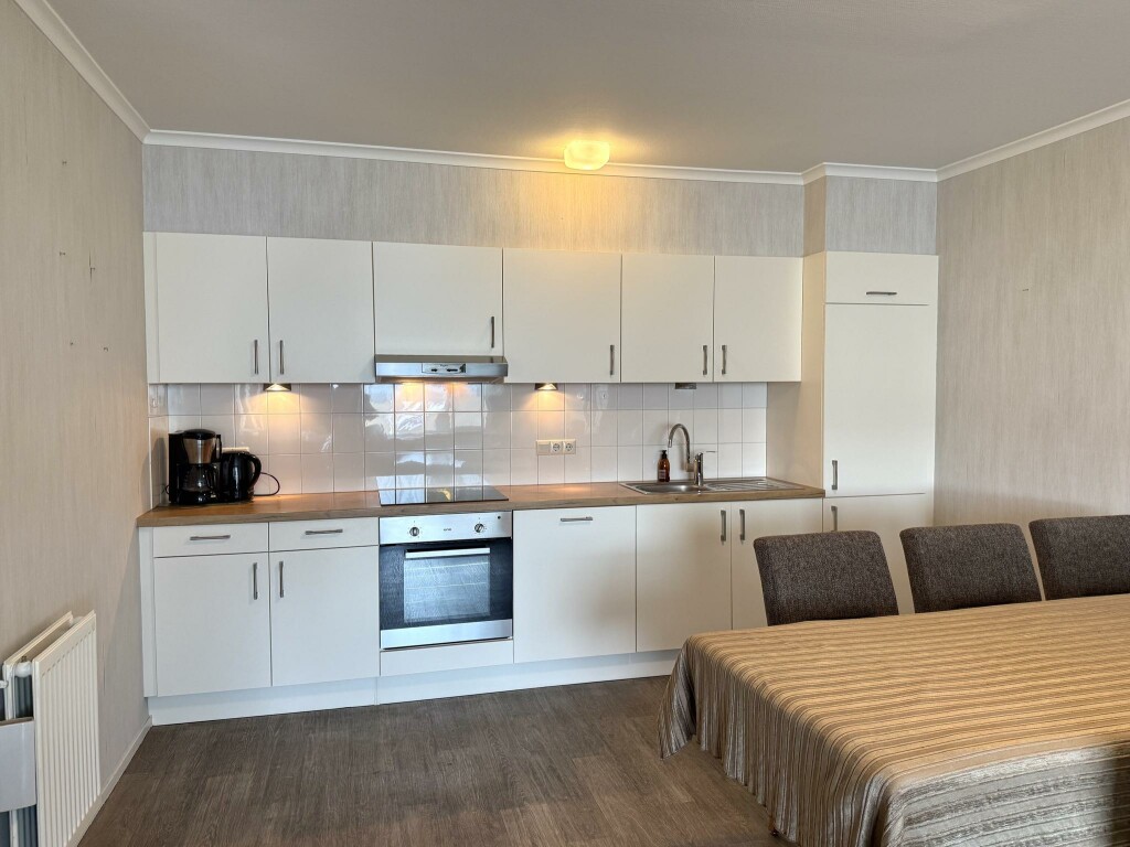 Het appartement is bereikbaar via zowel de lift als de trap in de centrale hal van het gebouw. De entree van het appartement geeft toegang tot de woonkamer, slaapkamer, badkamer en berging. De ruime en lichte woonkamer heeft directe toegang tot het balkon, waar u in de ochtend kunt genieten van de zon. De open keuken is vernieuwd in 2014 en voorzien van diverse inbouwapparatuur, waaronder een inductiekookplaat met afzuigkap, een oven, een koelkast en een vaatwasser.