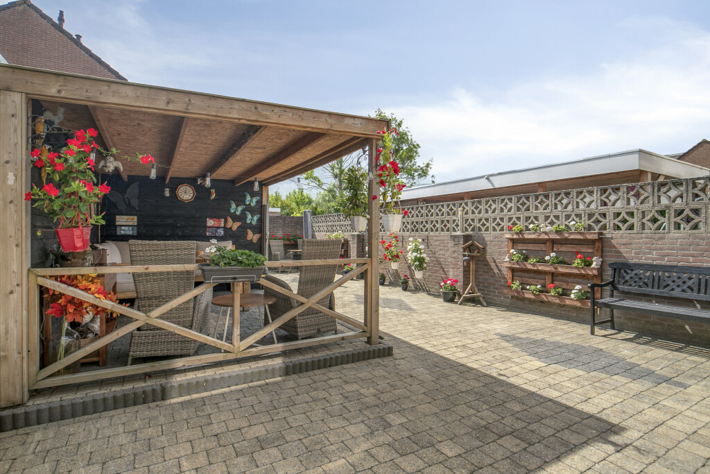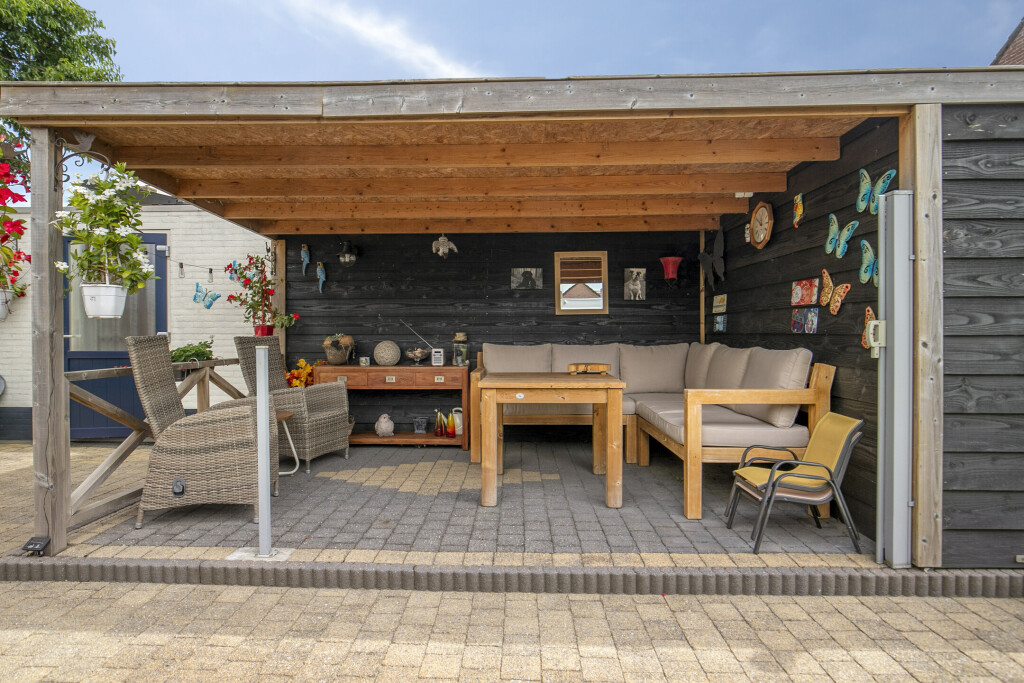Dankzij de overkapping kun je hier ook met minder weer heerlijk buiten zitten.