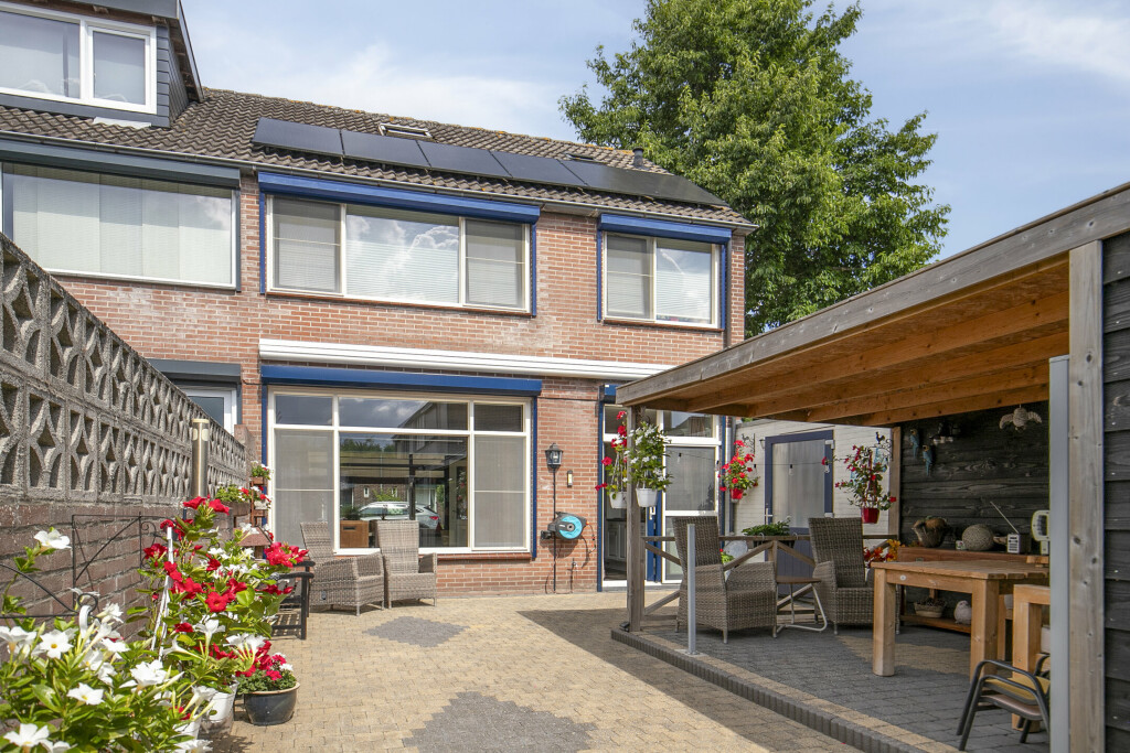 Aan de achterzijde van de woning zit een elektrisch zonnescherm over de hele breedte van het huis, zodat je ook heerlijk in de schaduw kan zitten.