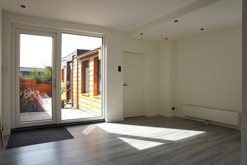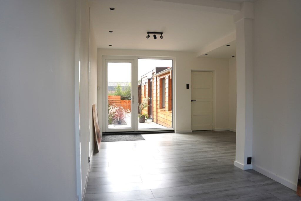 De lichte woonkamer is voorzien van een laminaatvloer en een tuindeur die zorgt voor een fijne verbinding met buiten. De sfeer is strak en eigentijds, mede dankzij de glad gestucte wanden en de rolluiken aan zowel de voor- als achterzijde.