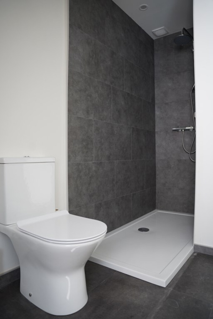 De badkamer is eveneens vernieuwd en beschikt over een inloopdouche, wastafelmeubel én een 2e toilet. Hier is er eveneens elektrische verwarming en belangrijk is ook de aanwezige mechanische ventilatie.