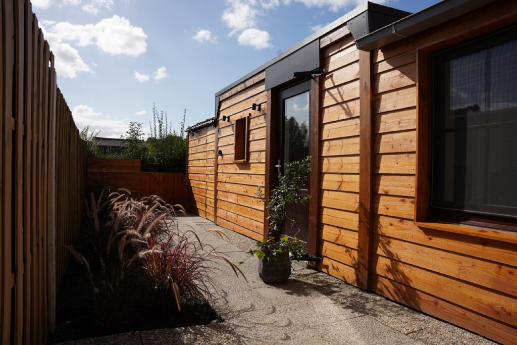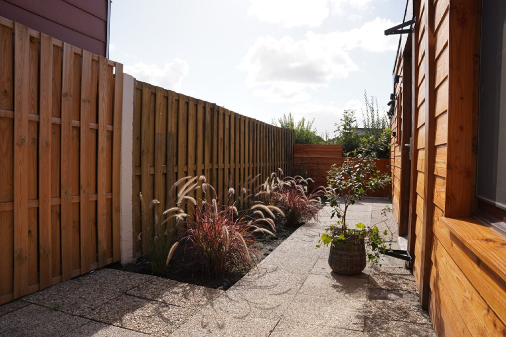 De tuin is onderhoudsvriendelijk aangelegd en beschikt over een achterom. Een fijne plek om te ontspannen of buiten te eten.