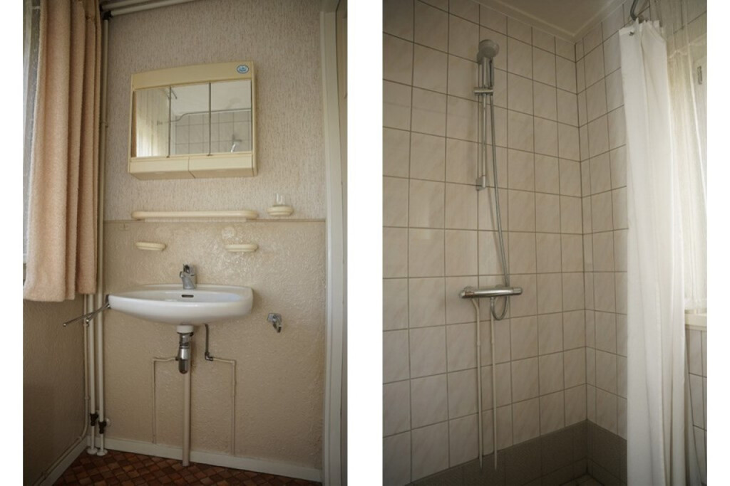 De badkamer is functioneel, maar compact en voorzien van een douche en een wastafel.