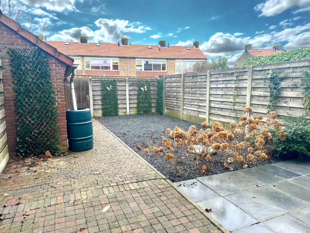 De woning beschikt over een compacte en onderhoudsvriendelijke tuin met een terras en een schuurtje voor extra bergruimte. De tuin is bovendien via een poort aan de achterzijde bereikbaar, wat zorgt voor extra gemak.