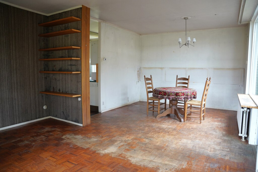 De woonkamer heeft een grote raampartij aan de voorzijde waardoor het daglicht rijkelijk binnenvalt. Hier zie je meteen de potentie: een fijne leefruimte die met een moderne afwerking weer volledig tot leven kan komen. Via de tuindeur loop je zo naar het zijterras.