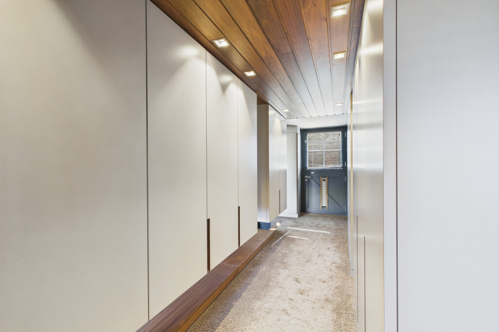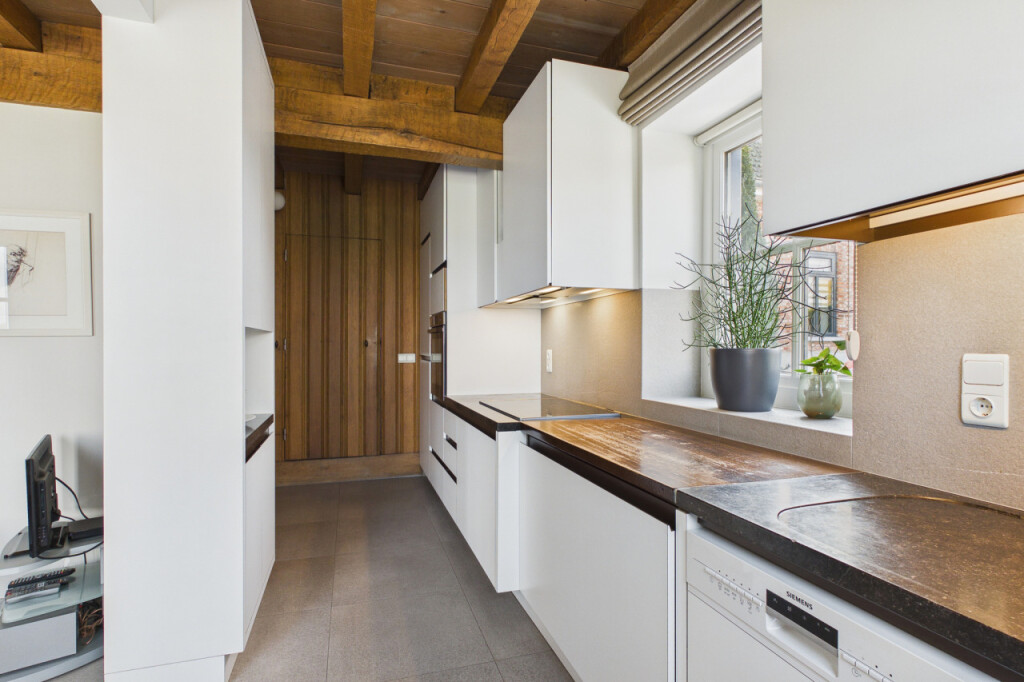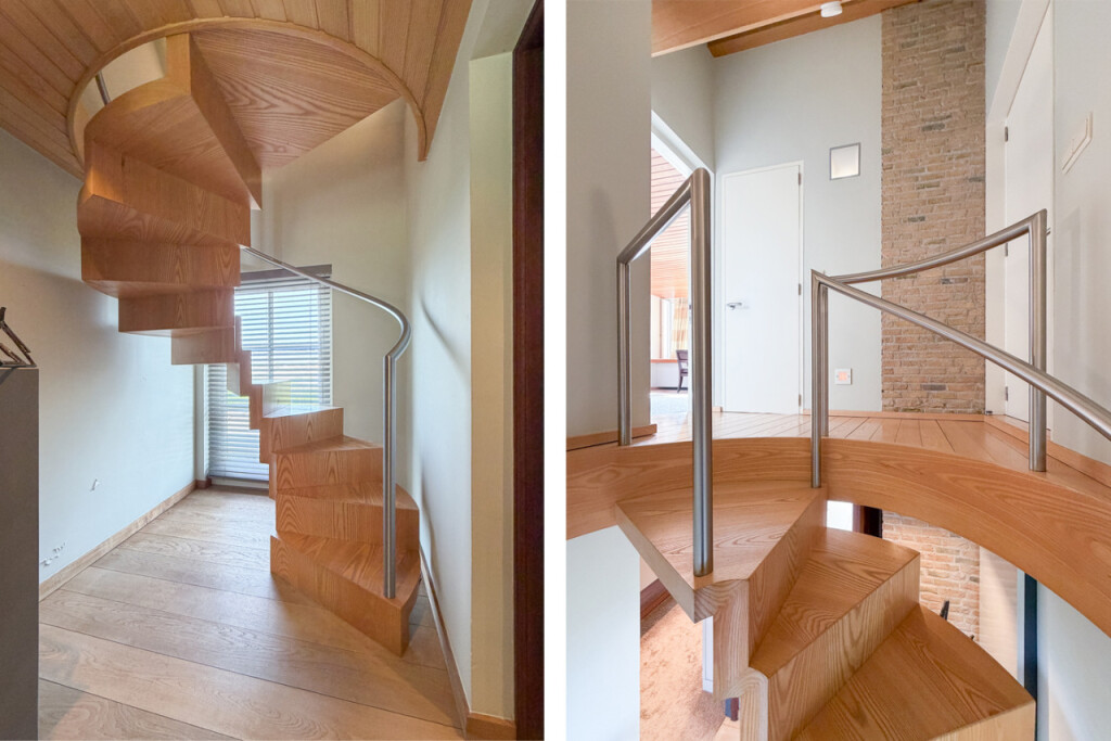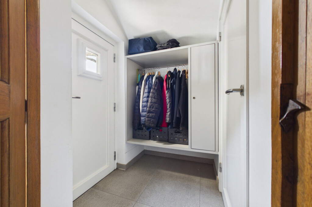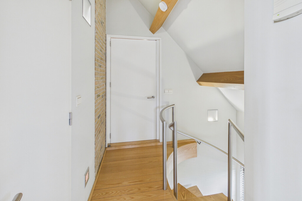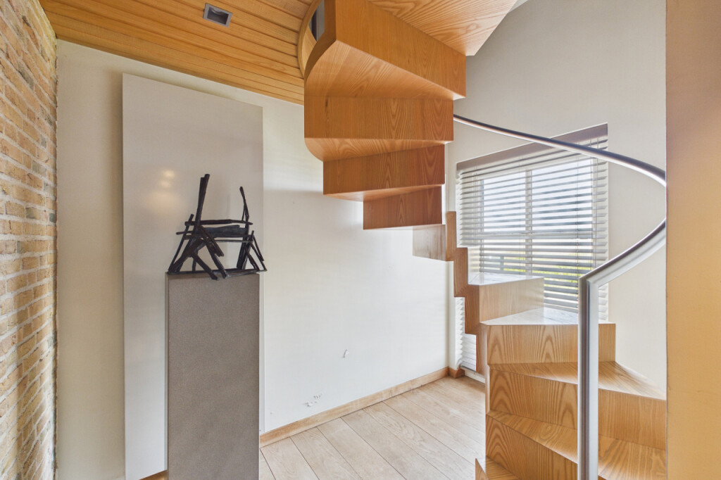 De bijkeuken biedt ruimte voor witgoedapparatuur en herbergt tevens de meterkast. In de hal bevindt zich een prachtige moderne essenhouten designtrap die leidt naar de verdieping, een echte blikvanger.