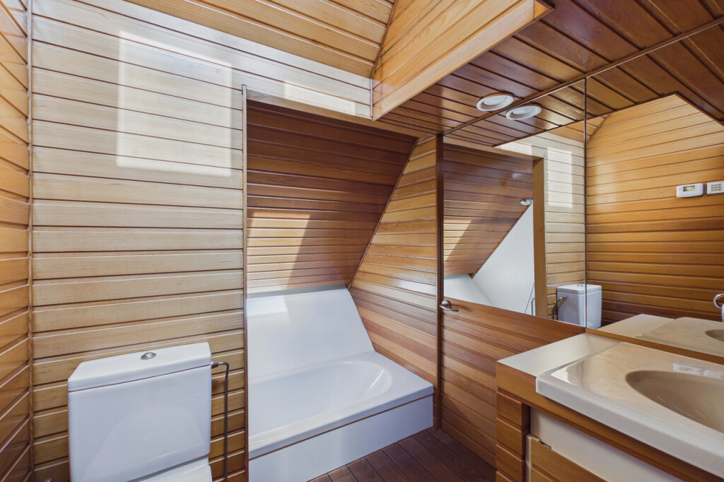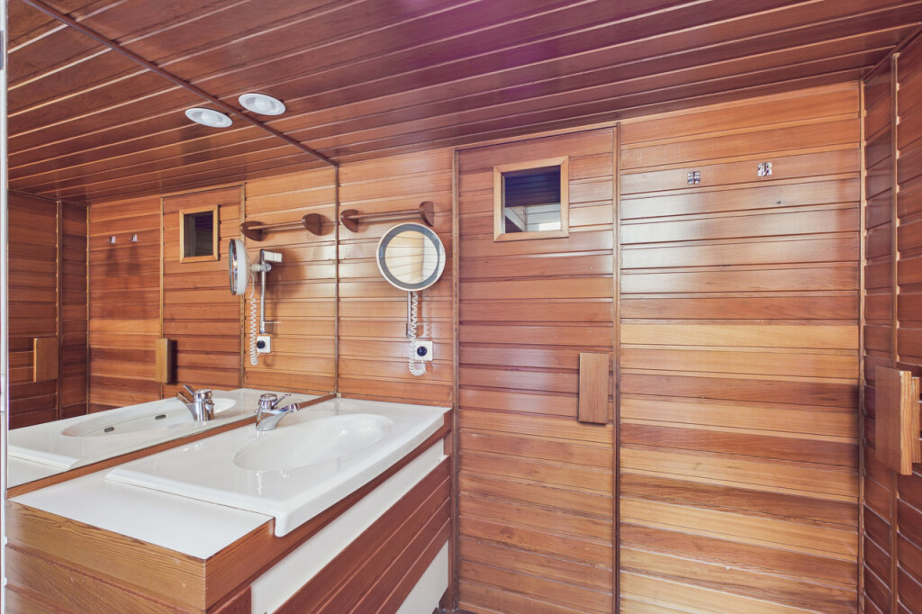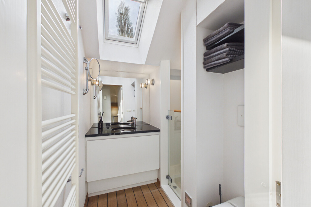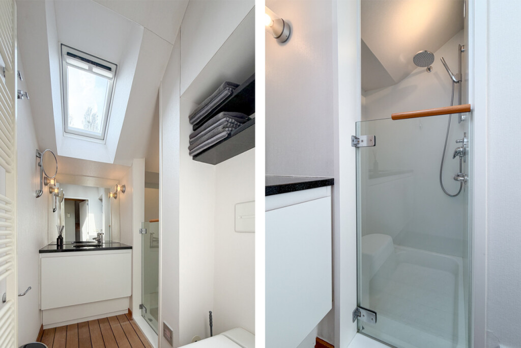 De verdieping beschikt over twee badkamers, beide uitgevoerd in stijlvolle bootstijl en elk met een eigen sfeer en afwerking. De eerste badkamer is uitgerust met een wastafelmeubel, douchecabine en zwevend toilet. De tweede badkamer biedt pure ontspanning met een ligbad met indirecte verlichting, een wastafelmeubel, toilet en een sauna.