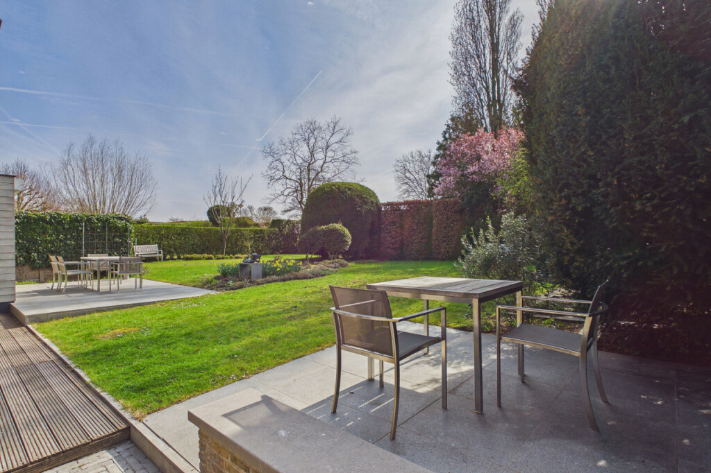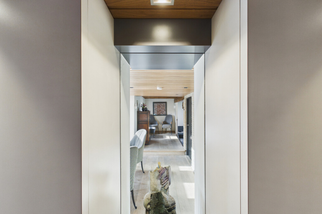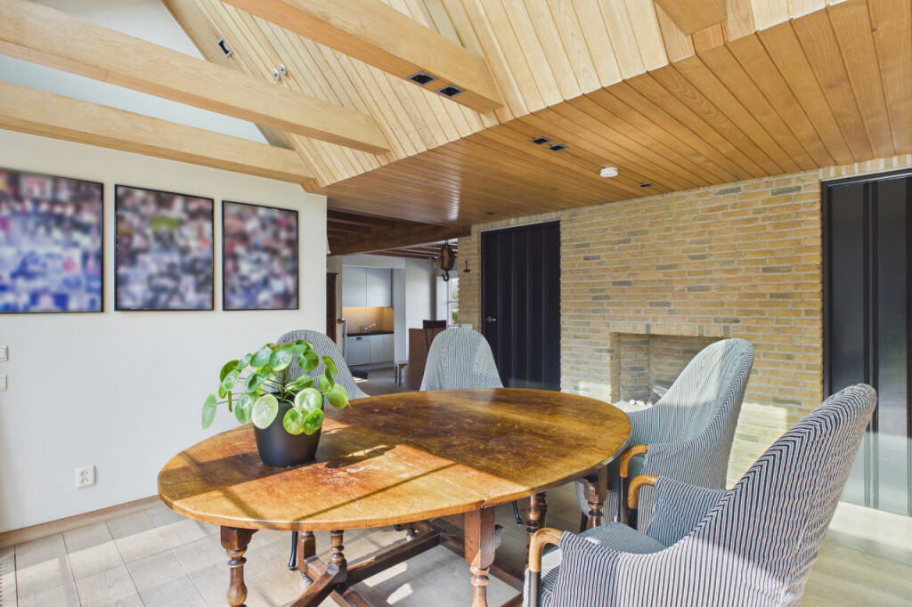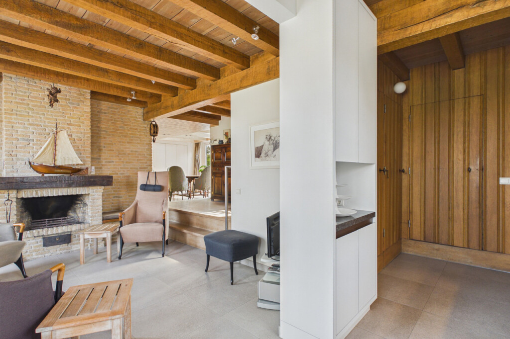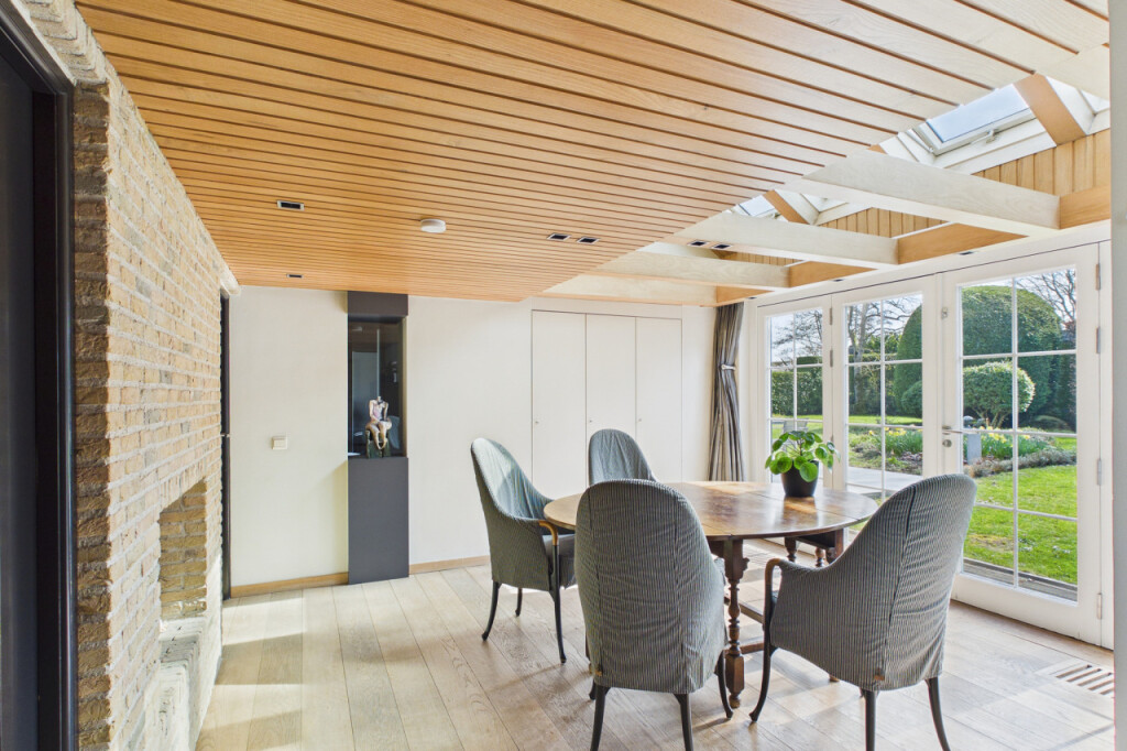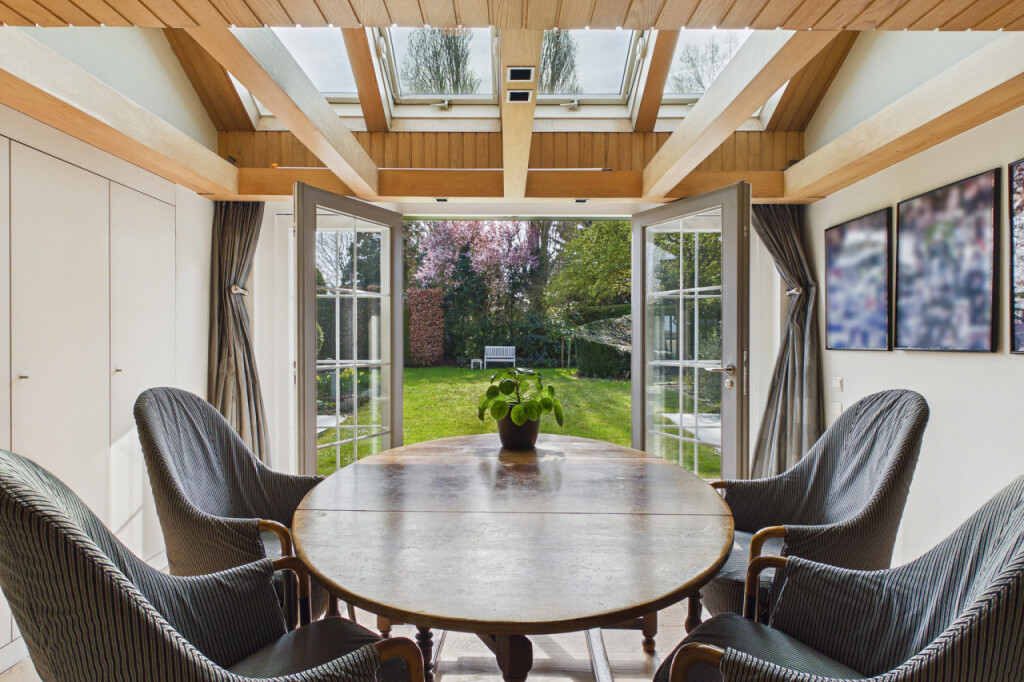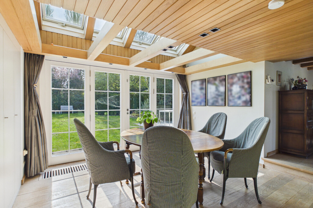 Via een charmant niveauverschil bereikt u de opkamer en de lichte eetkamer met tuindeuren. Grote raampartijen zorgen hier voor een overvloed aan natuurlijk licht en een prettige verbinding met de tuin.